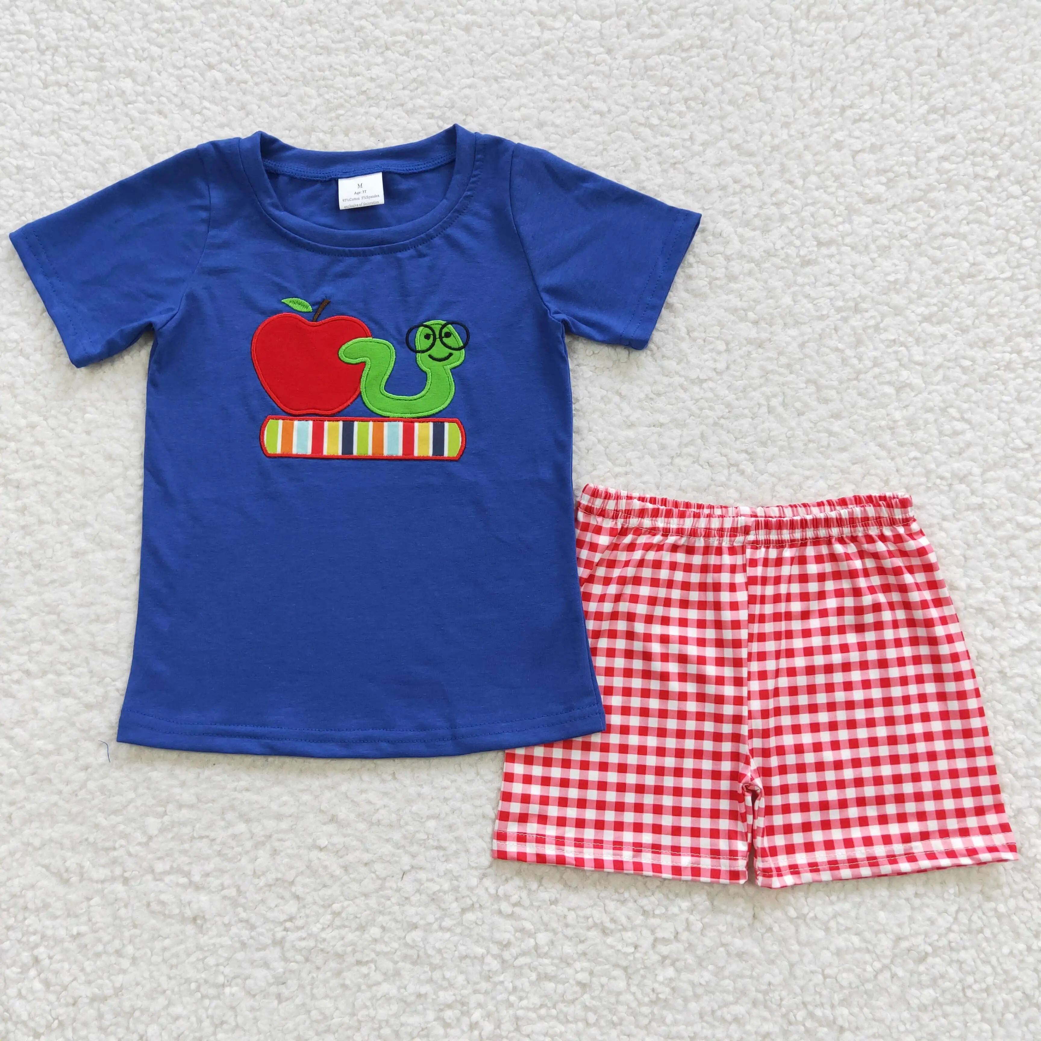 Высококачественные синие наряды с вышивкой «назад в школу» с яблоками, комплекты одежды для маленьких девочек, комплекты одежды для малышей и детей, комплекты одежды