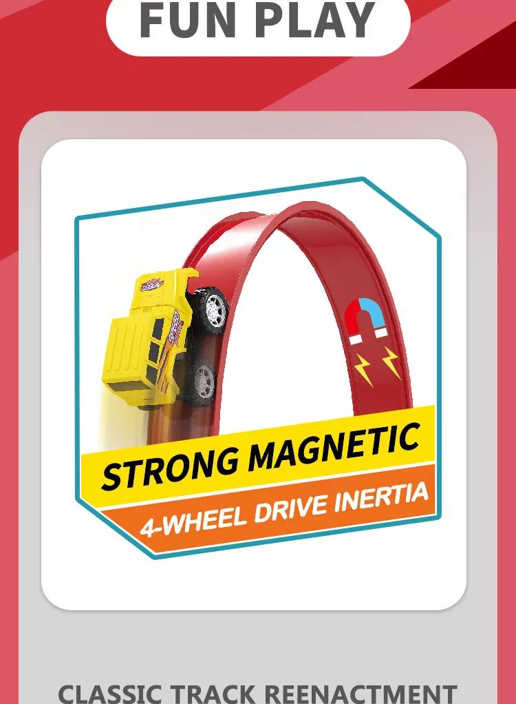 В комплект входят все необходимые элементы для сборки трека, а также машинки магнитные инерционные, которые и станут главным действующим лицом во время незабываемых представлений и гонок. В комплекте 25 деталей для сборки трека.