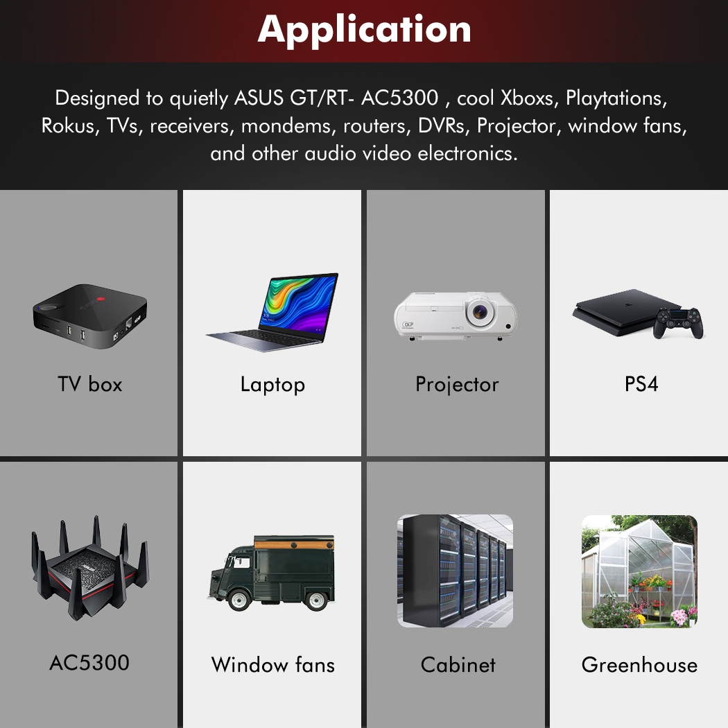 • Он подходит для рассеивания тепла в нижней части ТВ-бокса и системы рассеивания охлаждающего вентилятора сервера шкафа рабочей станции вашего оборудования и делает оборудование более эффективным.