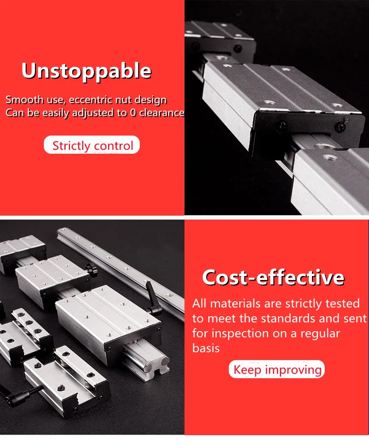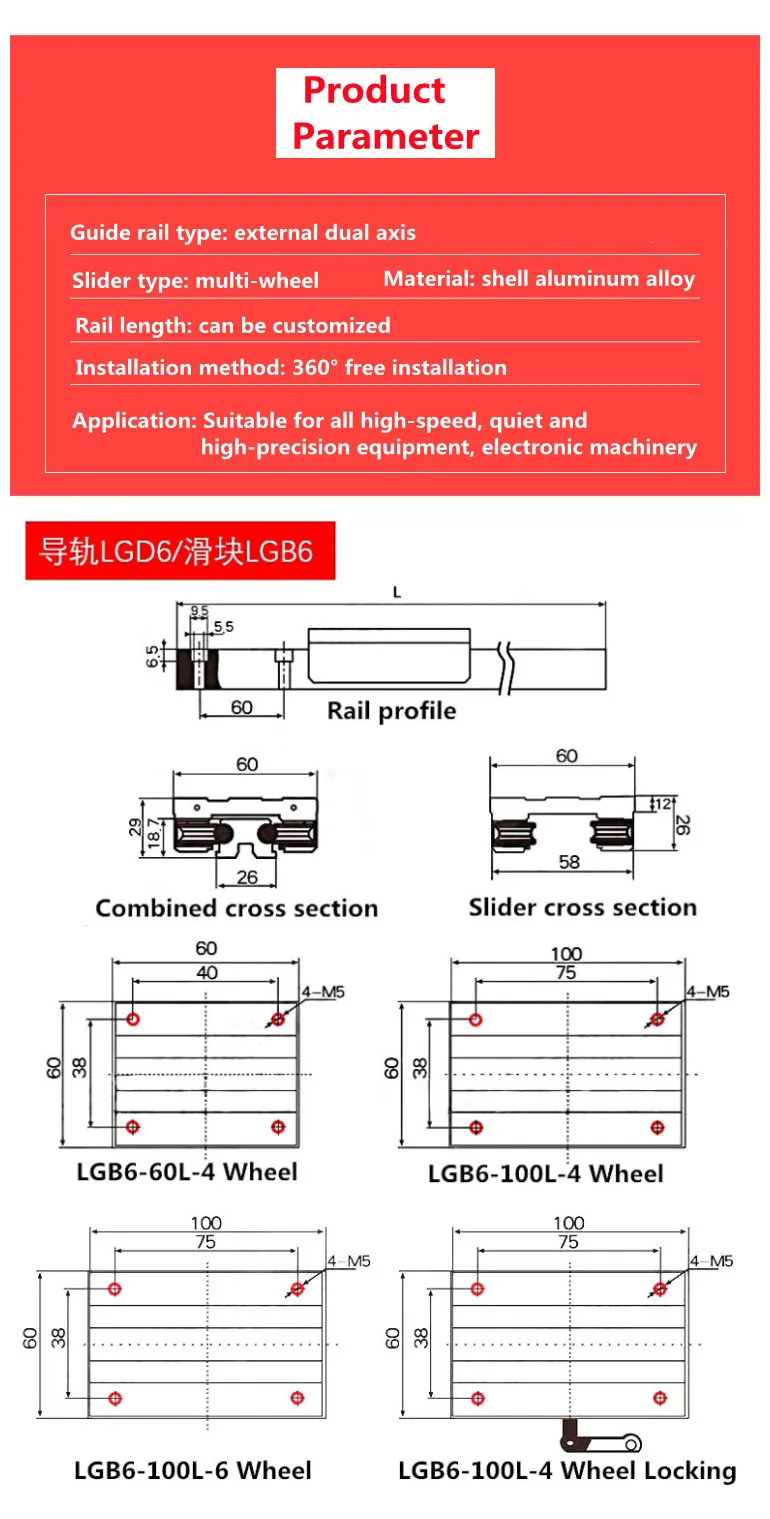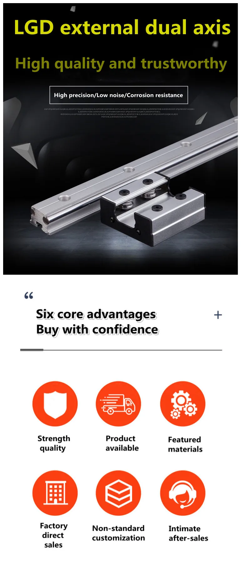 Линейная направляющая LGD в основном изготовлена из Облегченный Алюминиевый сплав, С инкрустацией линейной оптической оси С каждой стороны, Который работает довольно сбалансированно и имеет Хорошая износостойкость.