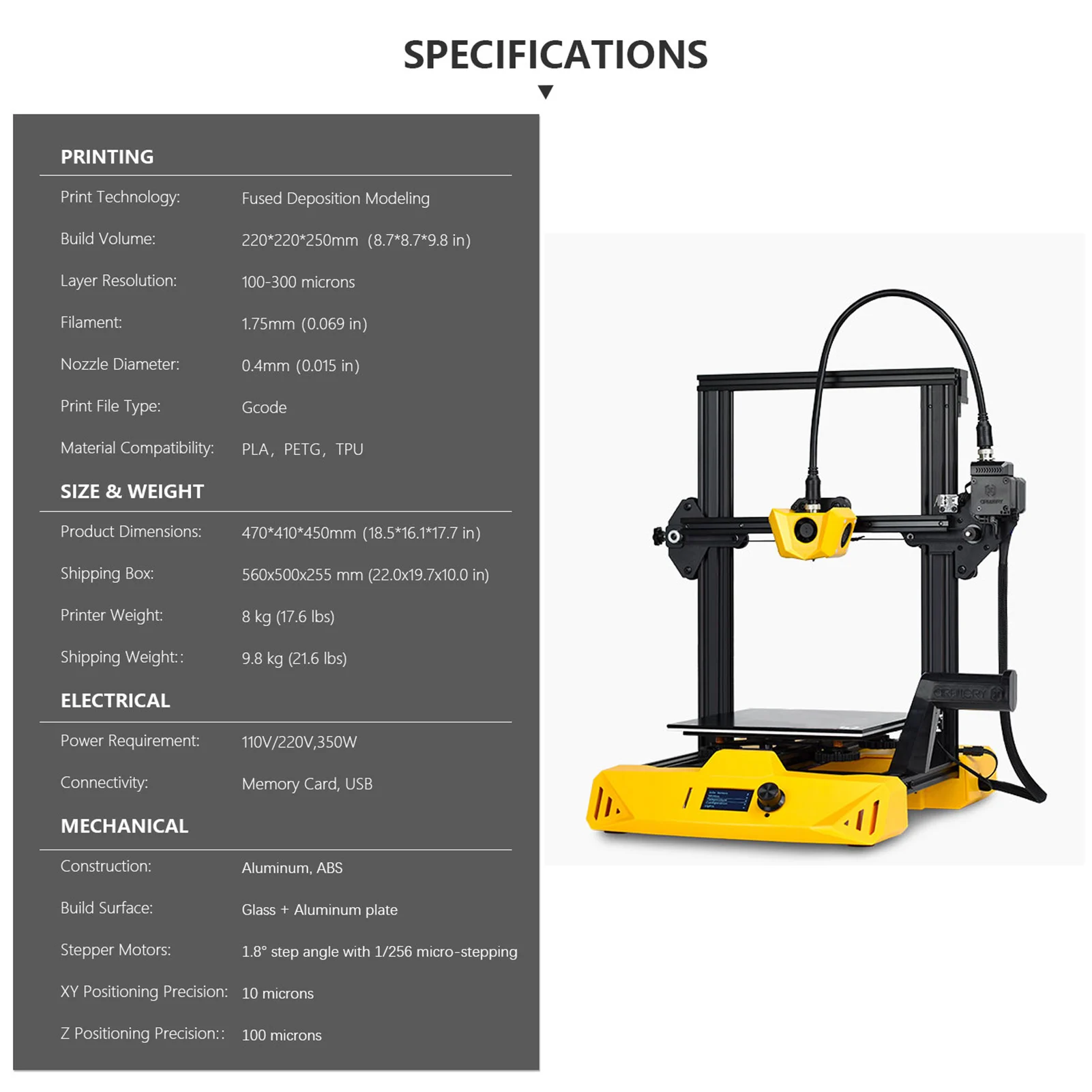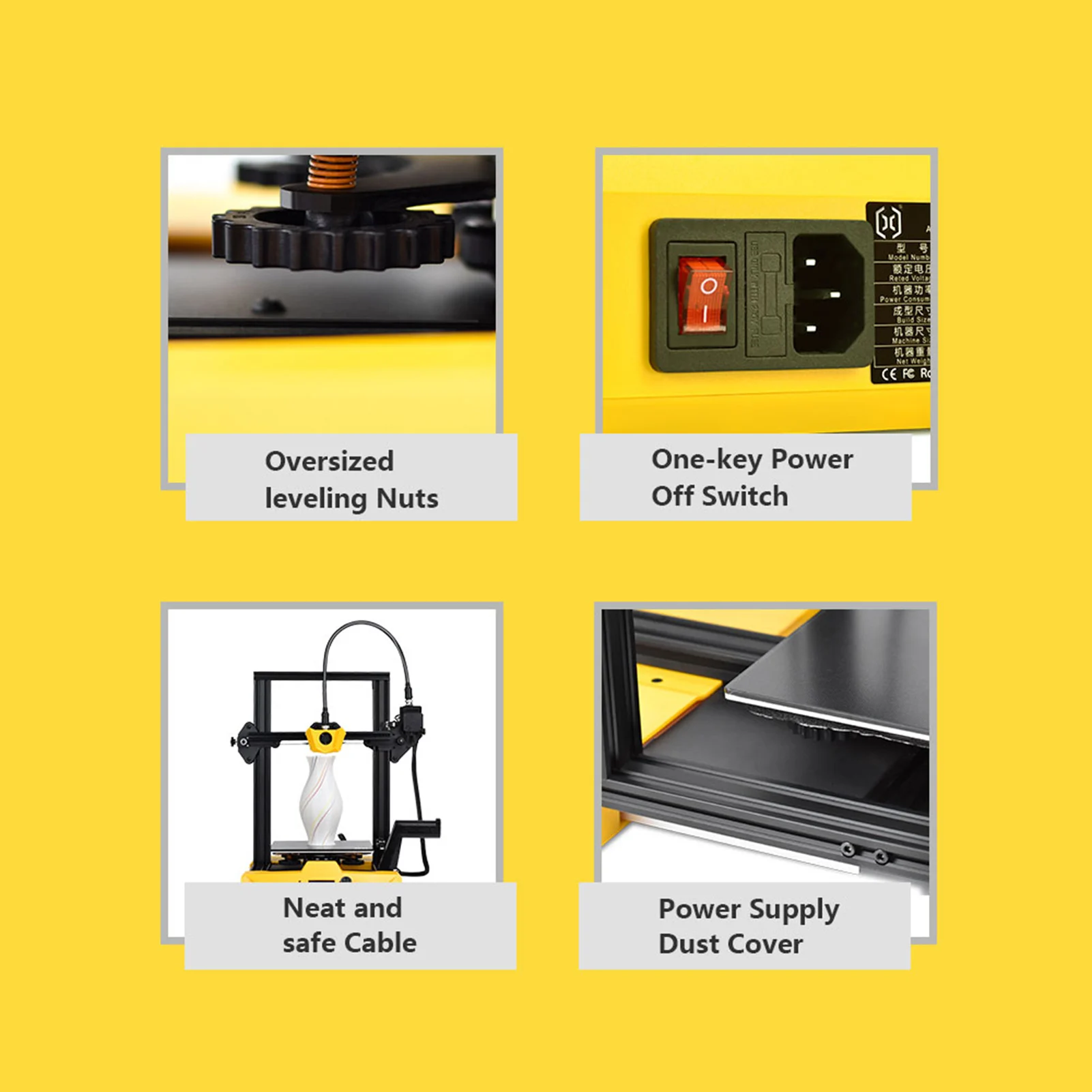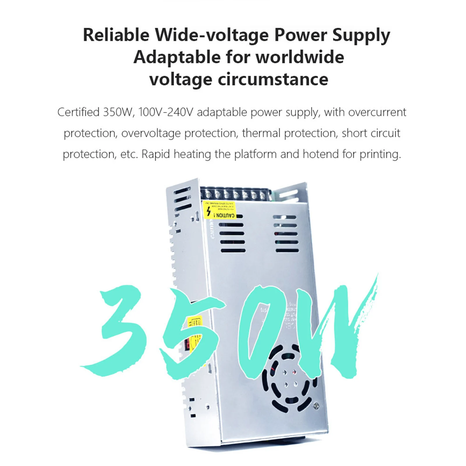 Электропитание безопасности:Сертифицированный адаптер питания мощностью 350 Вт, 100-240 В, с защитой от перегрузки по току, защитой от перенапряжения, тепловой защитой, защитой от короткого замыкания и т. Д. Быстрый нагрев платформы и хотенд для печати.