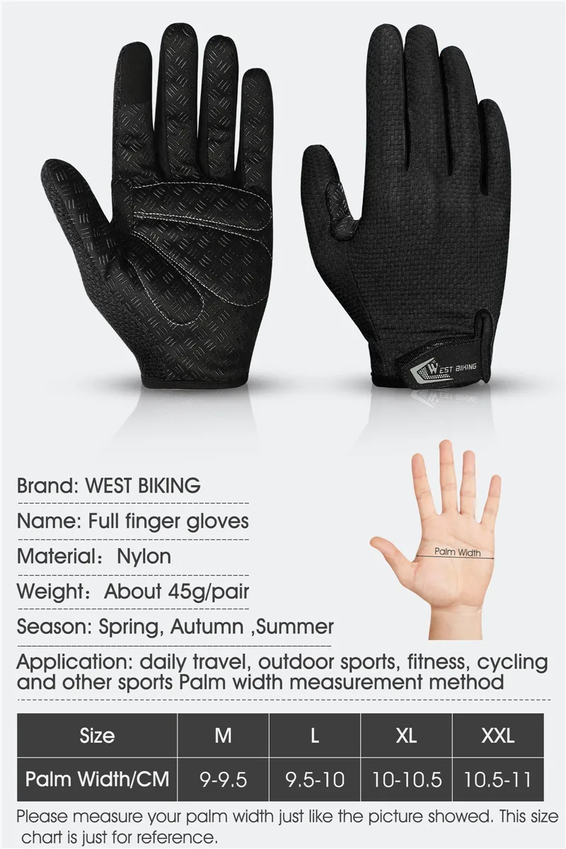 WEST BIKING, летние велосипедные перчатки, полный палец, MTB велосипедные перчатки, сенсорный экран, Нескользящие силиконовые перчатки для езды на велосипеде