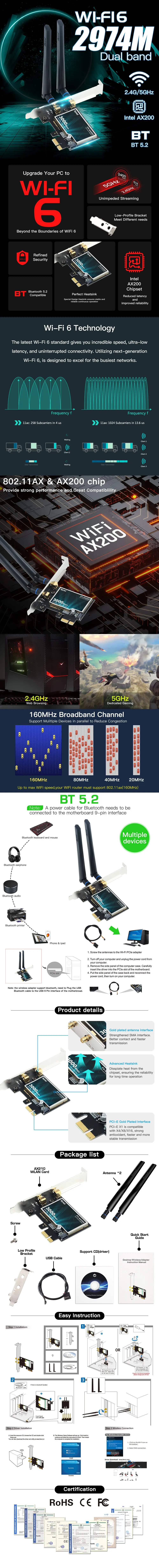 Wi-Fi 6 Intel AX200 3000Mbps беспроводной PCIe адаптер для рабочего стола двухдиапазонный 2,4G/5Ghz для Bluetooth 5,2 AX200NGW 802.11AX MU-MIMO Win10