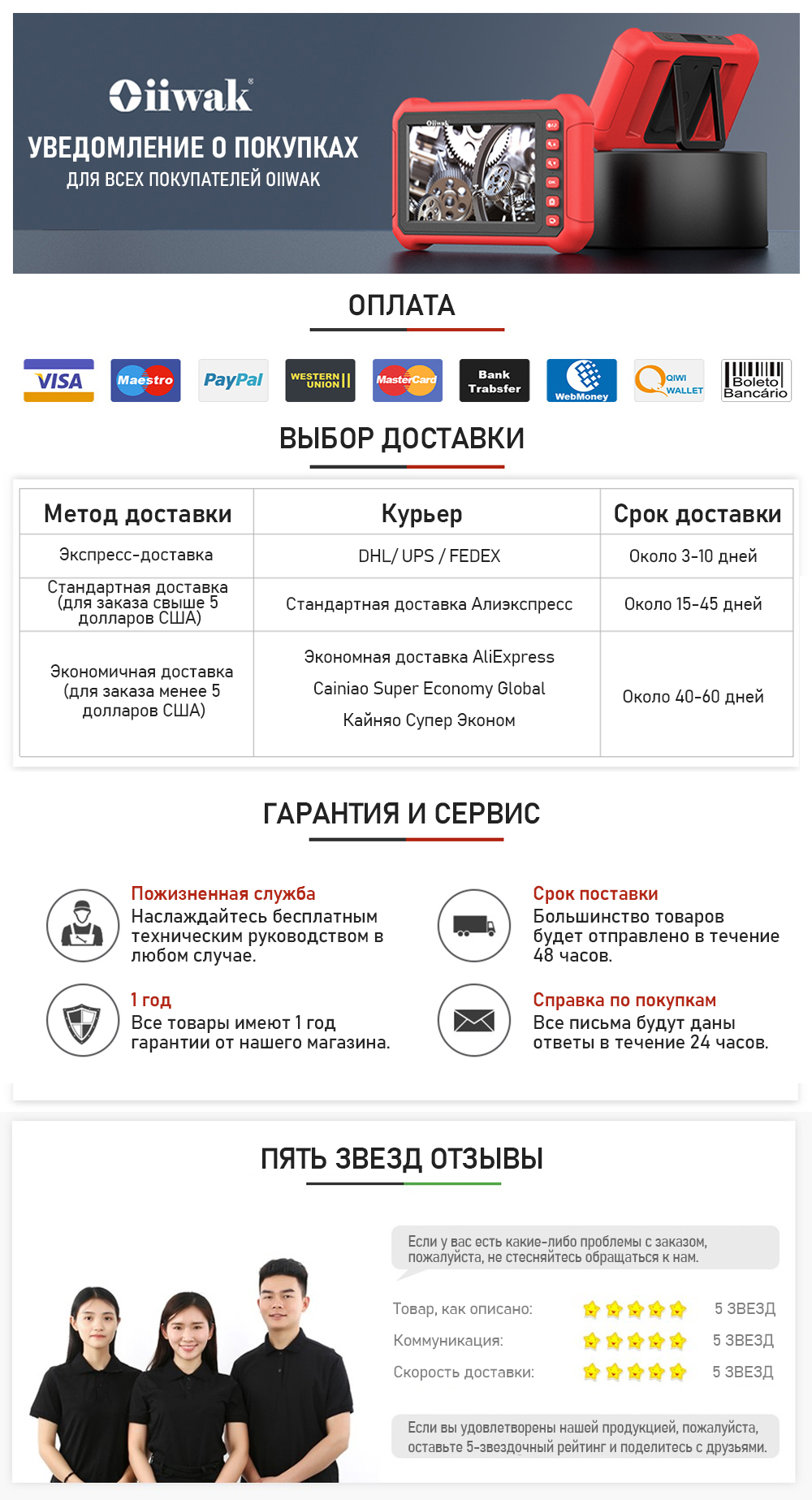 Oiiwak эндоскоп обеспечивает Неразрушающий осмотр труднодоступных мест, таких как ремонт автомобилей, канализационная Инспекционная камера, промышленный механический осмотр, сантехническая камера Змея с светильник, фиксация труб, внутренние стены, чердаки, желоба, канализационные трубы, вентиляционные отверстия, воздуховоды, моторы. Если у вас есть какие-либо вопросы о наших эндоскопах или руководствах, пожалуйста, свяжитесь с нами. Мы ответим вам в течение 24 часов и решим проблему для вас.