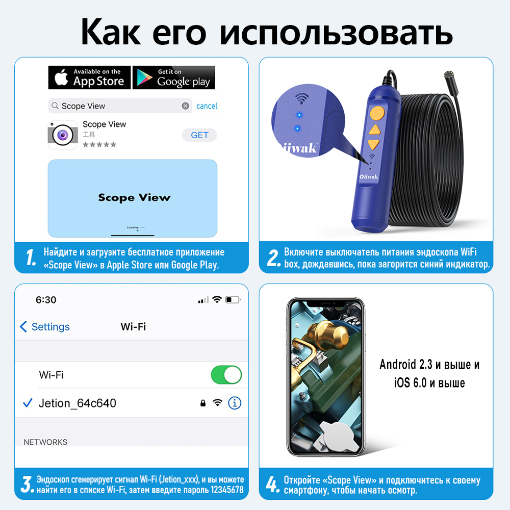 1. Эндоскоп должен использовать его самоактивирующийся WiFi сигнал, не требует домашнего WiFi, может использоваться на открытом воздухе.