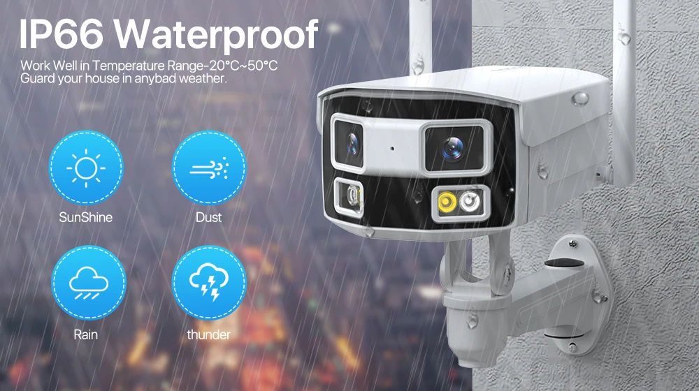 Эта WiFi-камера имеет прочный корпус и корпус, Уровень водонепроницаемости IP66 делает ее идеальной для наружного наблюдения. Он может выдерживать суровые погодные условия. Включая дождь, снег, сильный холод и жару