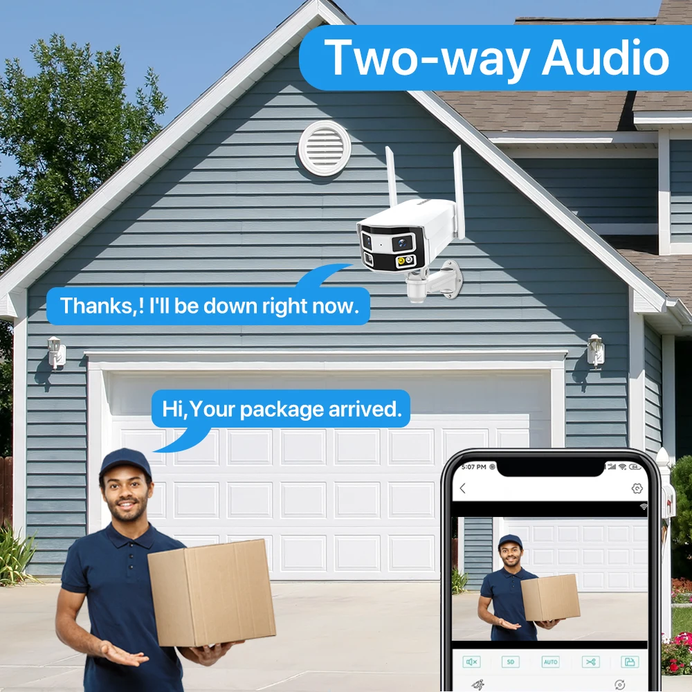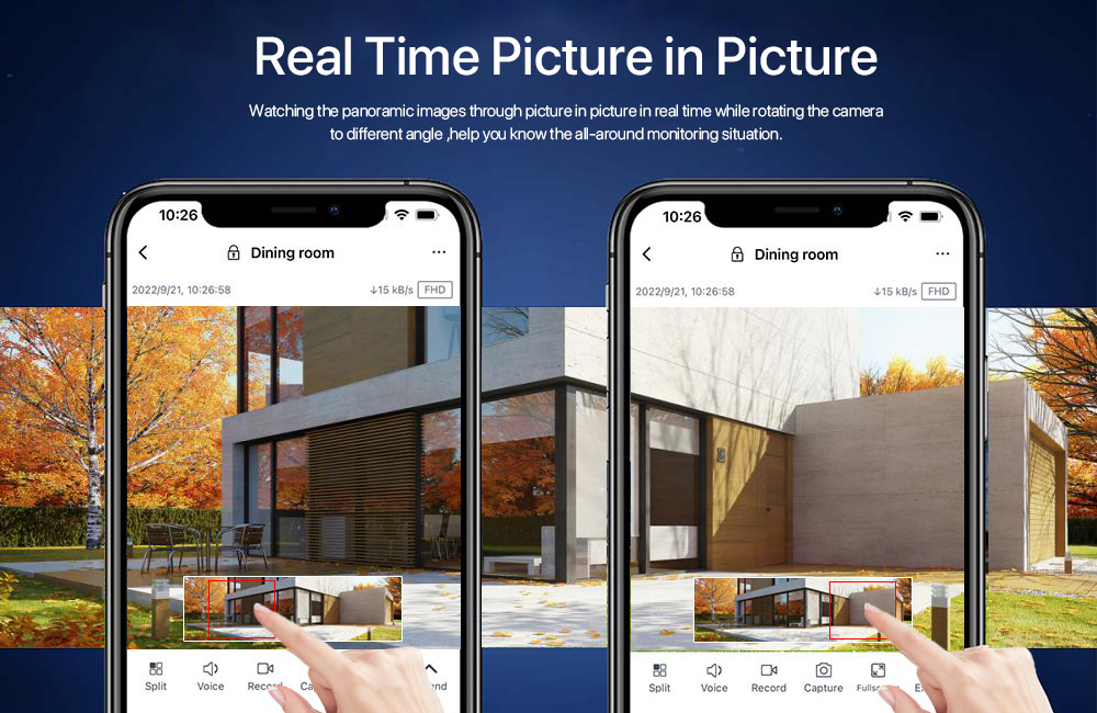 Ваша камера смотрит панорамные изображения через изображение в картинке в режиме реального времени, поворачивая камеру под другим углом, помогая вам узнать ситуацию со всесторонним мониторингом.
