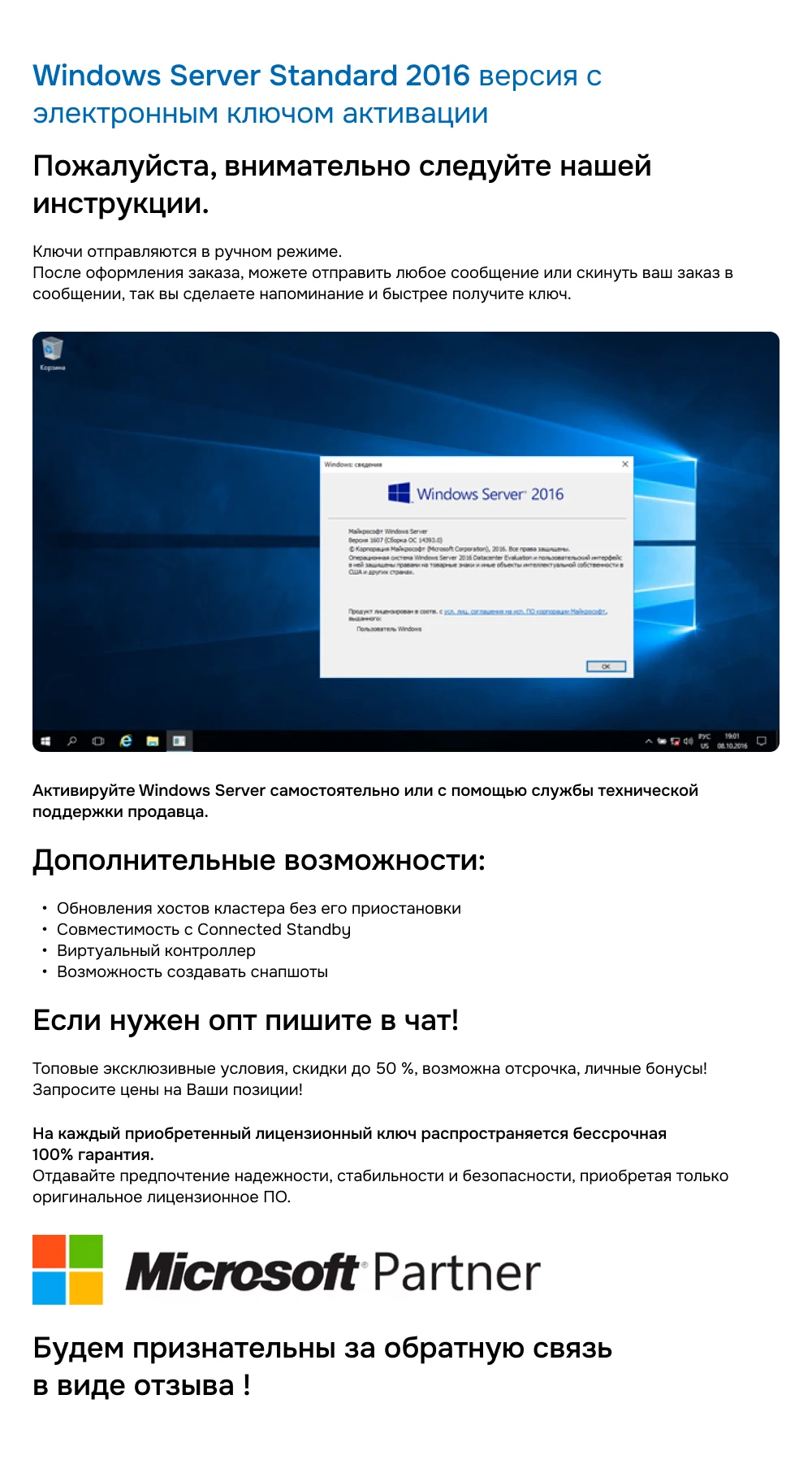 Windows Server Standard 2016 key, windows activation key, ключ продукта, retail, бессрочная лицензия, автоматическая доставка.
