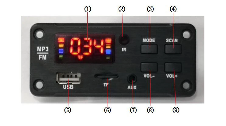 3.MODE: Switching of USB / TF / FM / AUX / Bluetooth-compatible;