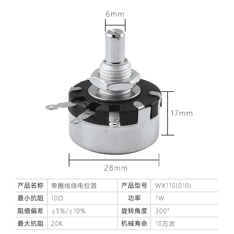 WX110 WX010 1 Вт 22 100 220 470 Ом 1K 2,2 K 3,3 K 4,7 K 10K 22K 3Pin 6 мм круглый металлический вал однооборотный проволочный ранечный потенциометр