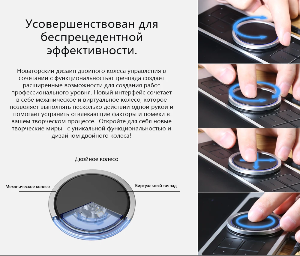 2. Новый инновационный двойной интерфейс колеса сочетает в себе механическое и виртуальное колесо, что позволяет выполнять несколько действий одной рукой. Это также помогает избежать отвлечения и перебоев от вашего рабочего процесса и творческого процесса. с двумя колесами, это проще и быстрее, чем когда-либо, чтобы запечатлеть, записывать, рисовать и изменить, гарантируя большую скорость и полный фокус на вашем творении.