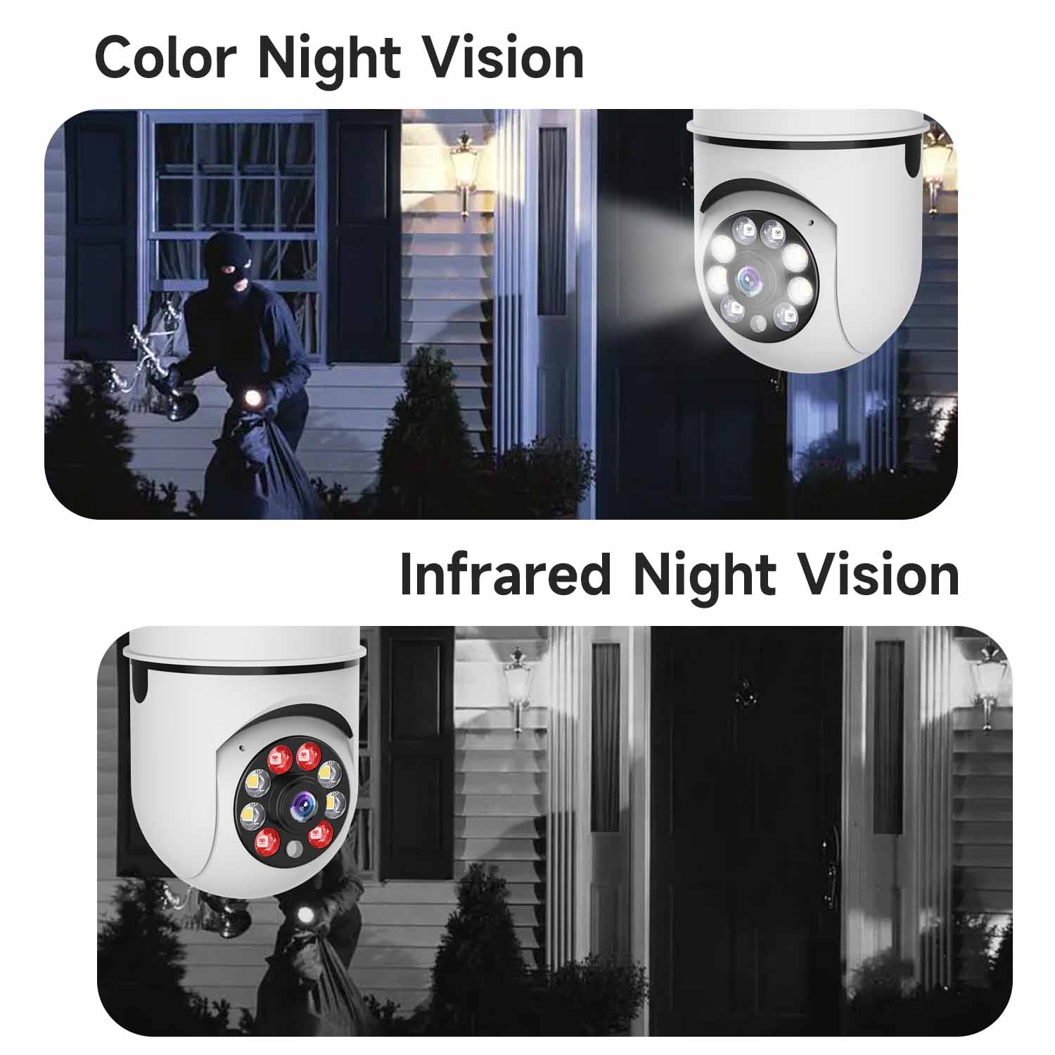 Когда камера обнаруживает человеческую форму, она переключается на полноцветное ночное видение, а когда никого нет, она переключается на инфракрасное ночное видение ночного видения.
