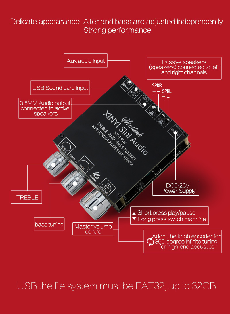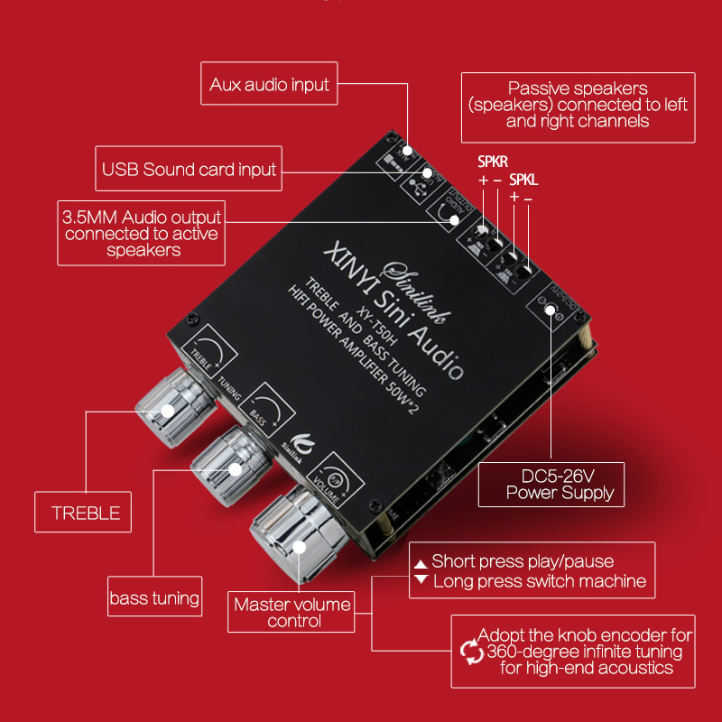 XY-T50H TPA3116D2 2*50W Bluetooth 5,0 панель усилителя сабвуфера 2,0 каналов Высокая мощность аудио стерео AUX USB Бас AMP
