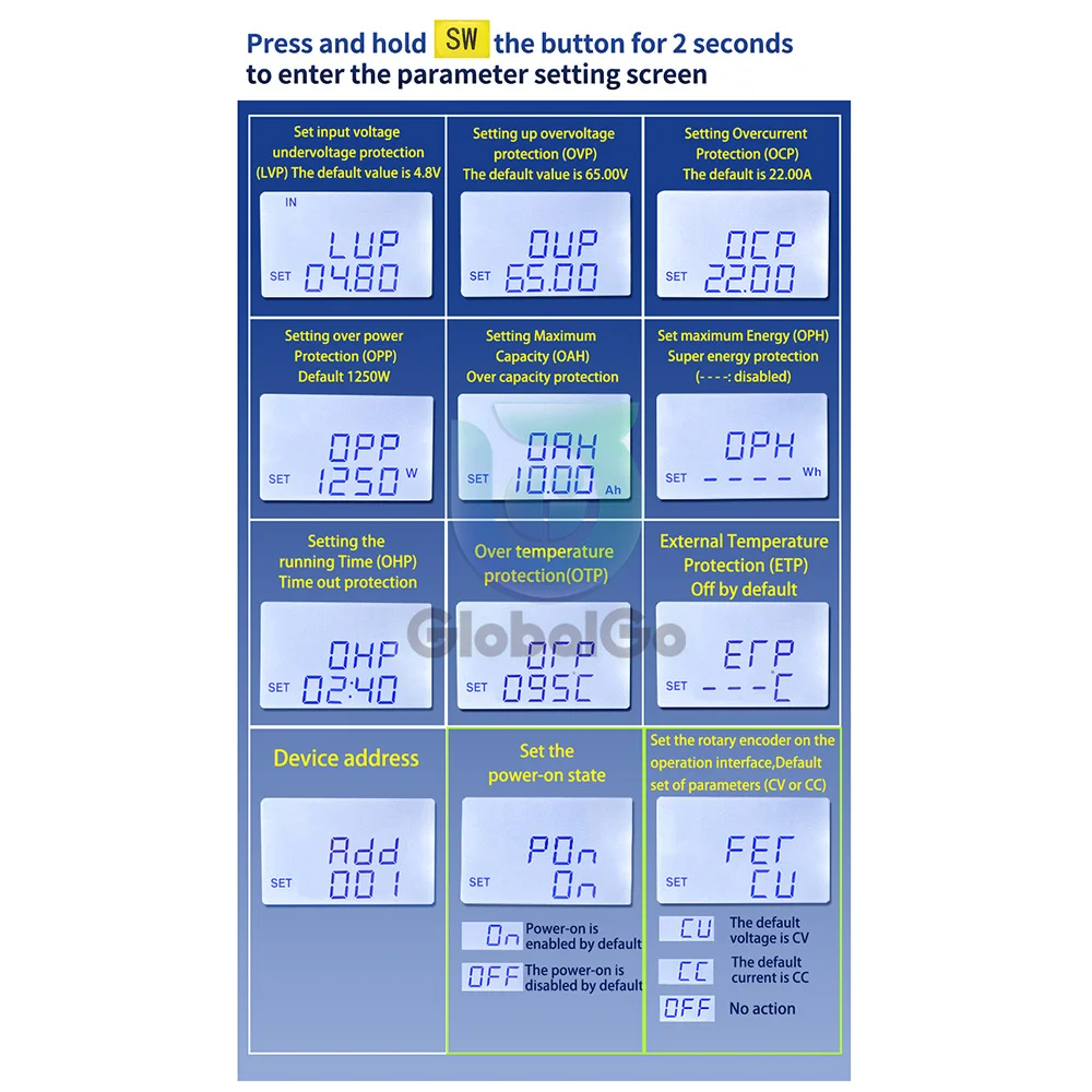 Супер Защита энергии: 0 ~ 9999WH, регулируемый и закрытый по умолчанию