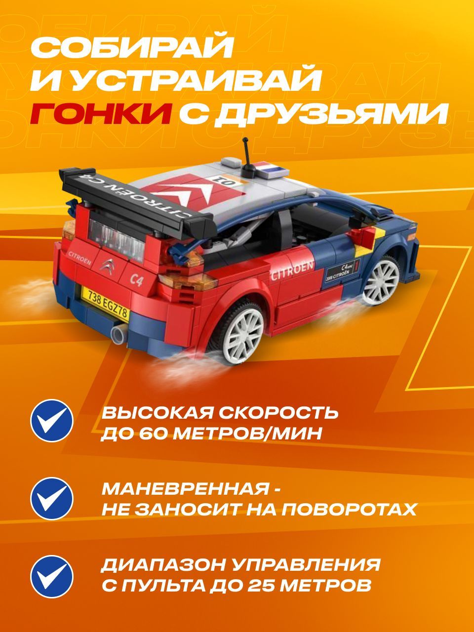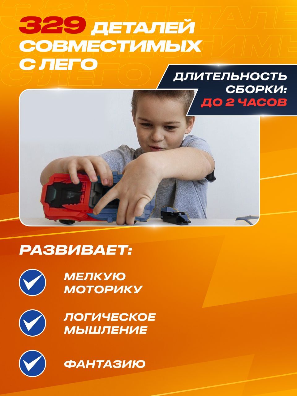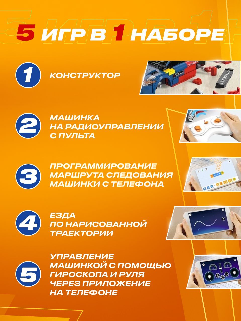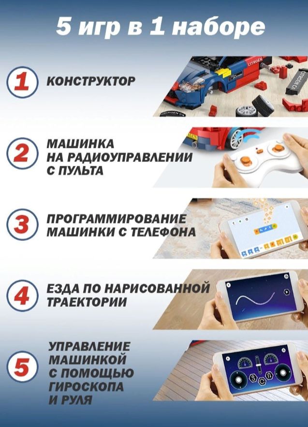 Вы сможете удивить не только маленького ребенка, но и самого взыскательного взрослого, будь то ваш друг или подруга, муж, любимый мужчина или близкий друг.Сразу 5 игр в 1 набореМашинка электронный конструктор позволяет найти бесчисленные возможности для игры и создания собственных гоночных соревнований между взрослыми и детьми любых возрастов старше 6 лет. Благодаря увлекательным гоночным машинкам конструкторам маме и папе теперь не надо ломать голову, чем занять своих детей, чтобы выкроить пару часов свободного времени в тишине.Собирай и устраивай гонки с друзьями!Машинка электронный конструктор не оставит равнодушным никого: яркие и реалистичные детали сразу окунут всех взрослых и маленьких мальчиков и девочек в неизведанный мир скоростных супер тачек!Машинка не развалится на поворотеСобрав увлекательный 3d конструктор техник для мальчиков, вы станете счастливым обладателем радиоуправляемой машинки.