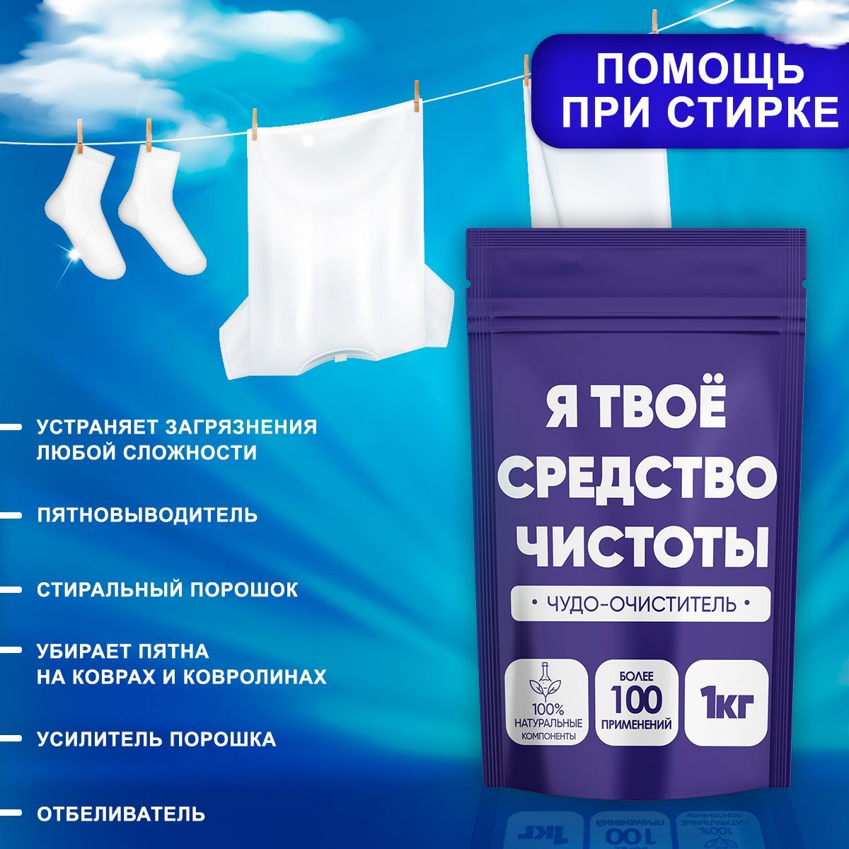 Описание: “Я твоё средство чистоты” - идеальное многофункциональное средство для удаления пятен и посторонних запахов для всех поверхностей дома и дачи.Средство специально разработано для эффективного удаления различных пятен.Активный кислород в составе отбеливателя осветляет белую одежду и постельное белье, удаляет пятна с белых и цветных тканей.Благодаря высококачественному перкарбонату натрия порошок способен работать даже при температуре в +60 °C. Более того, наше средство можно использовать как тот самый усилитель порошка.