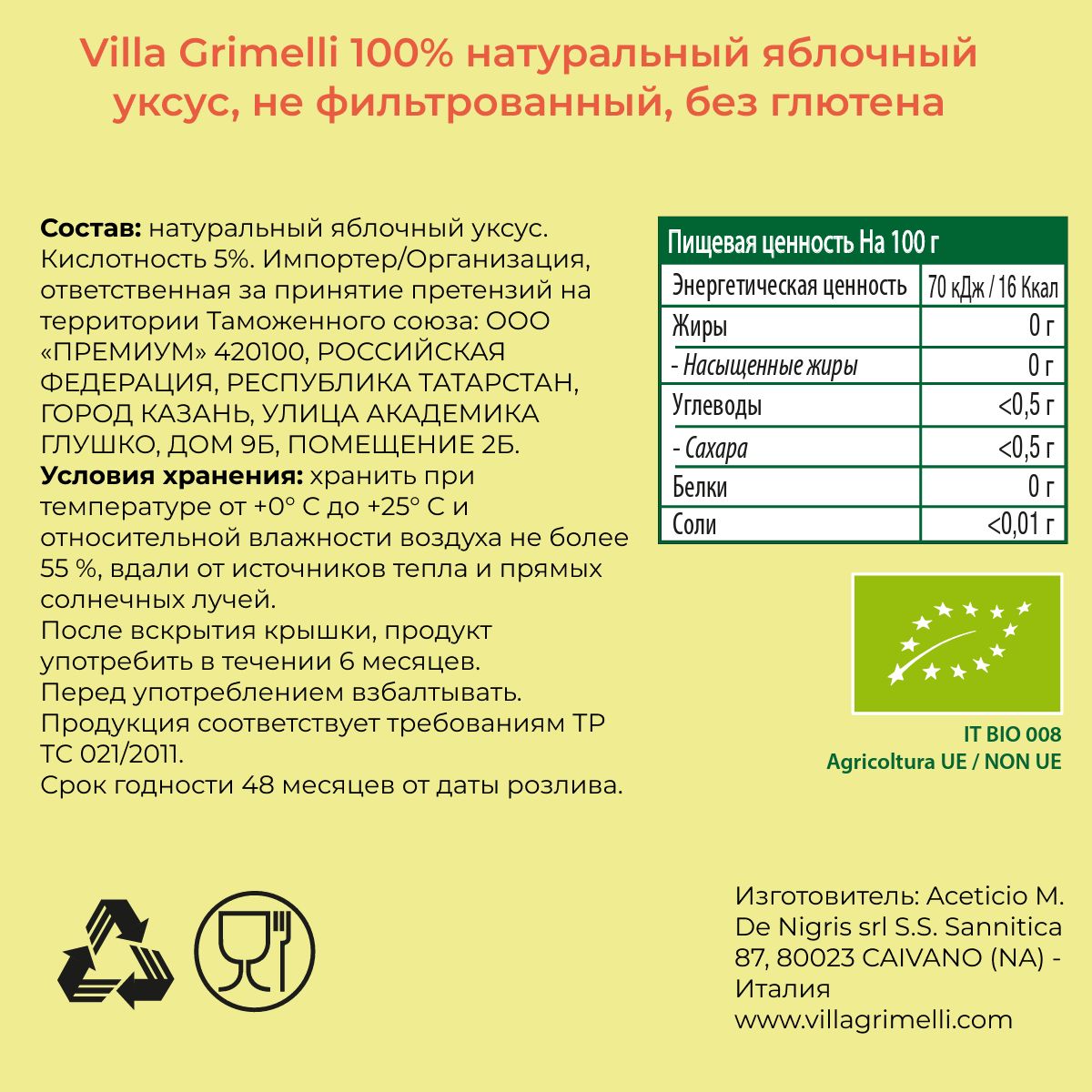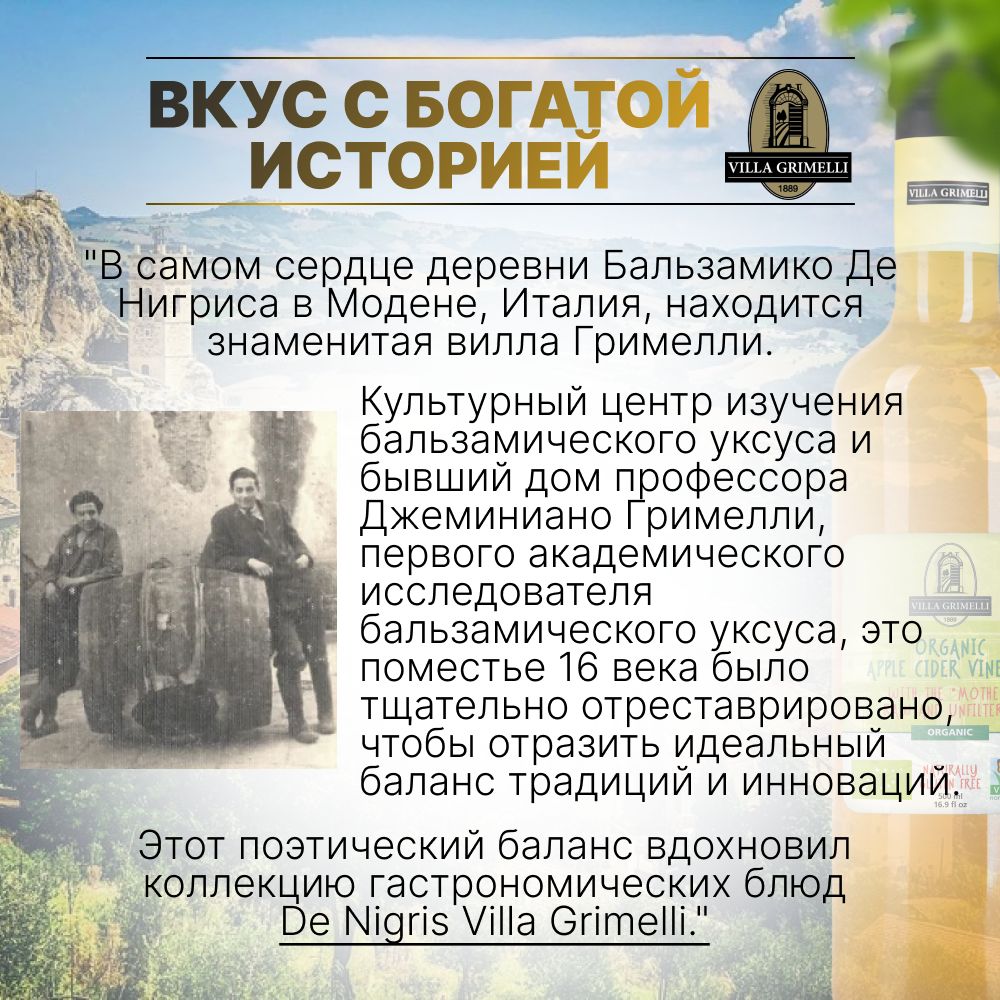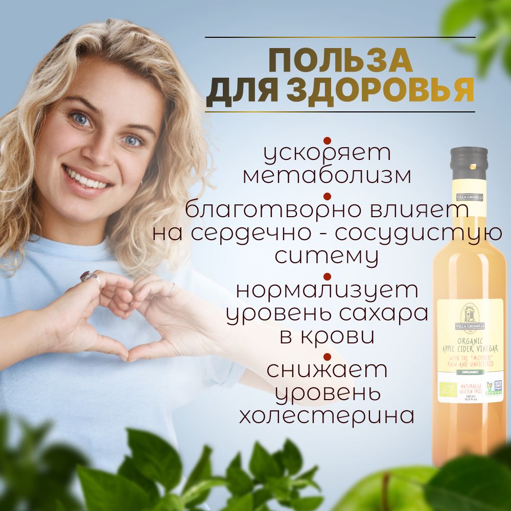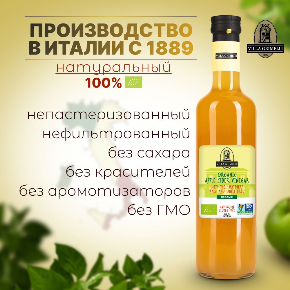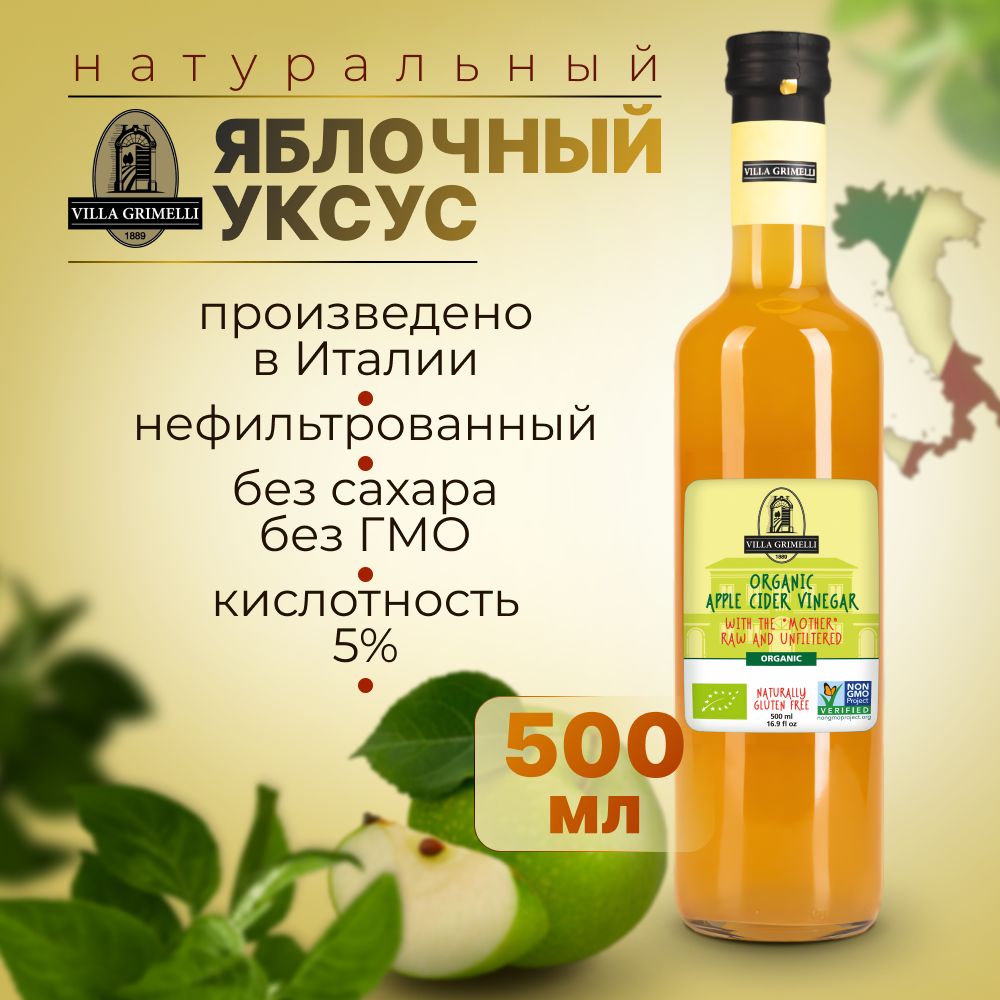 Яблочный уксус натуральный нефильтрованный непастеризованный Итальянский VILLA GRIMELLI 500 мл.