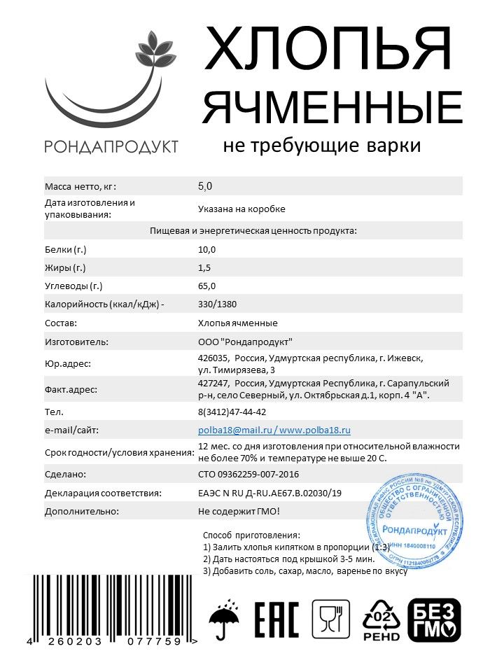 Ячменные хлопья не требующие варки, 5 кг, каша быстрого приготовления, диетические, весовые, Рондапродукт