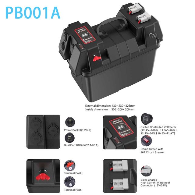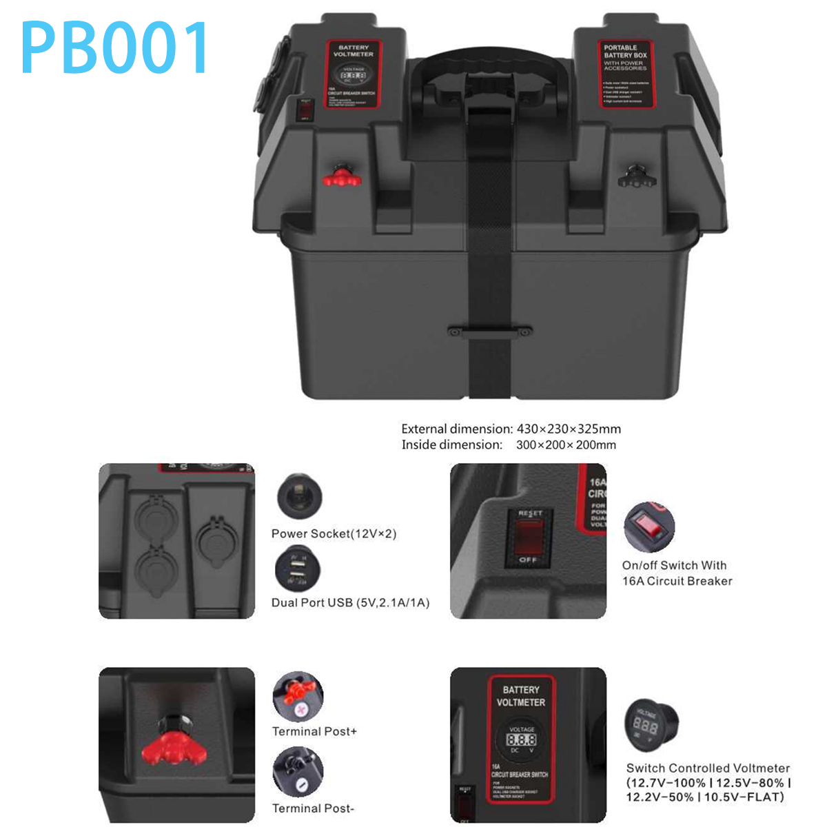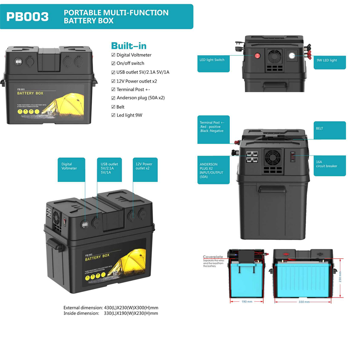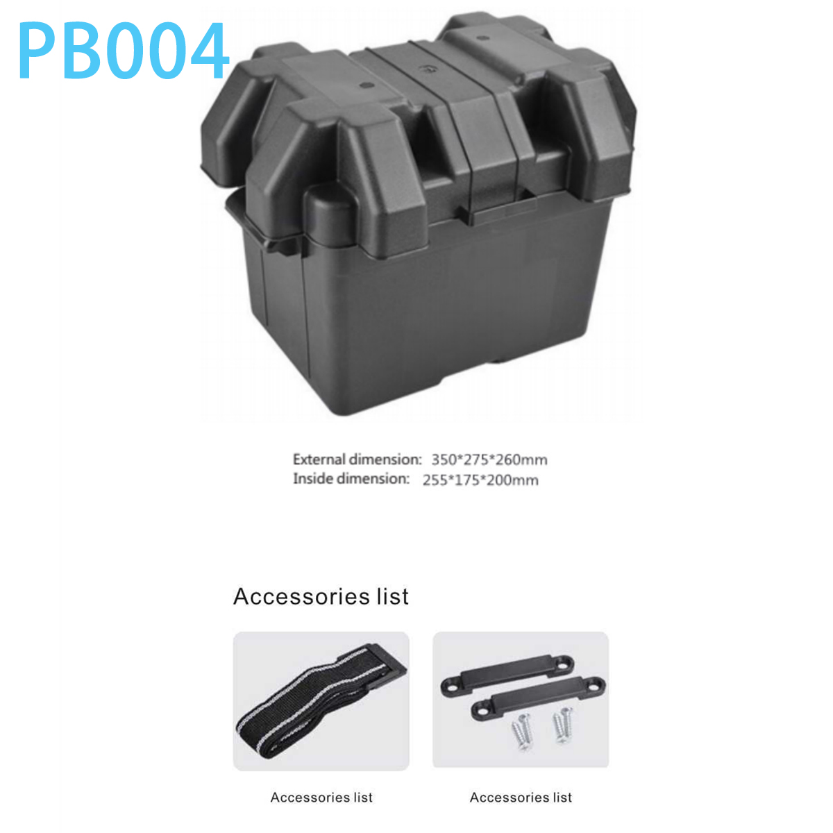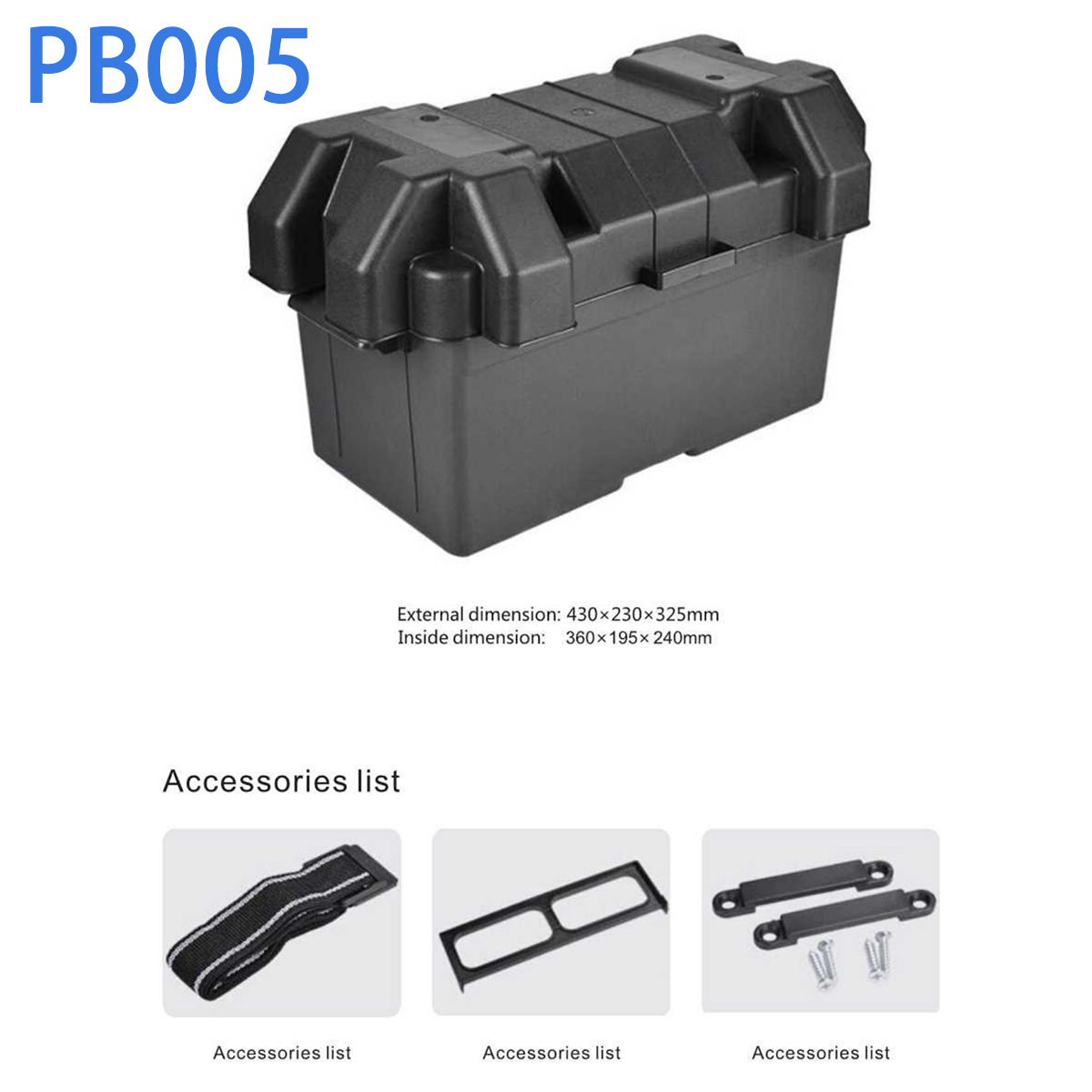 Battery Box Inside Dimensions: PB001/PB001A: 300x200x200mm/11.8x7.8x7.8inch. PB002A: 330x200x200mm/12.9x7.8x7.8inch. PB003: 330x190x230mm/12.9x7.4x9.0inch. PB004: 255x175x200mm/10.0x6.8x7.8inch. PB005: 360x195x240mm/14.1x7.6x9.4inch.