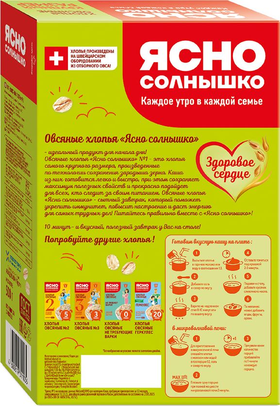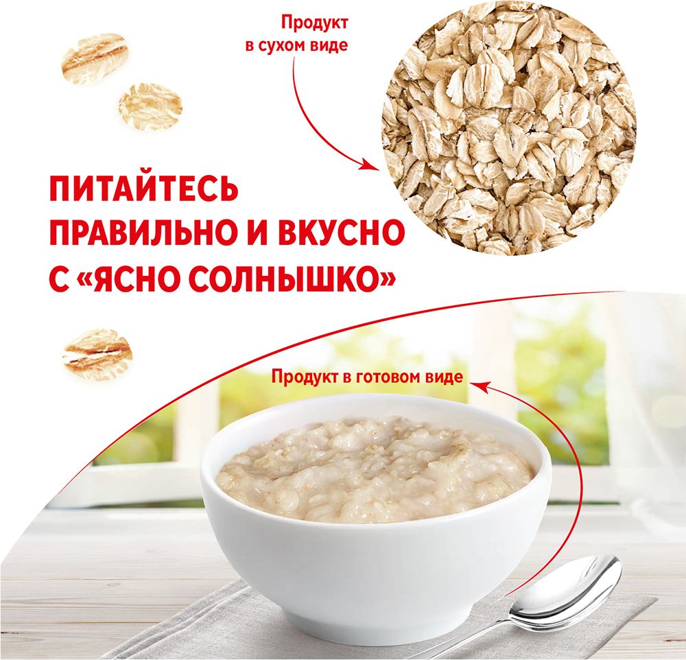 Описание: Овсяные хлопья №1 бренда «Ясно Солнышко» изготавливаются по специальной технологии сохранения зародыша зерна и имеют самый крупный размер в линейке номерных хлопьев «Ясно Солнышко». В составе овсяных хлопьев много полезных и жизненно необходимых макро и микроэлементов, они укрепляют иммунитет и заряжают энергией на целый день! Овсяная каша прекрасный диетический продукт и положительно влияет на ЖКТ. Удобный формат небольшой упаковки (500 г) овсяных хлопьев крупного размера отлично подойдет для домашнего использования и легко уместится на кухонной полке. Порадуйте себя и близких вкусными и здоровыми завтраками от ТМ «Ясно Солнышко»!