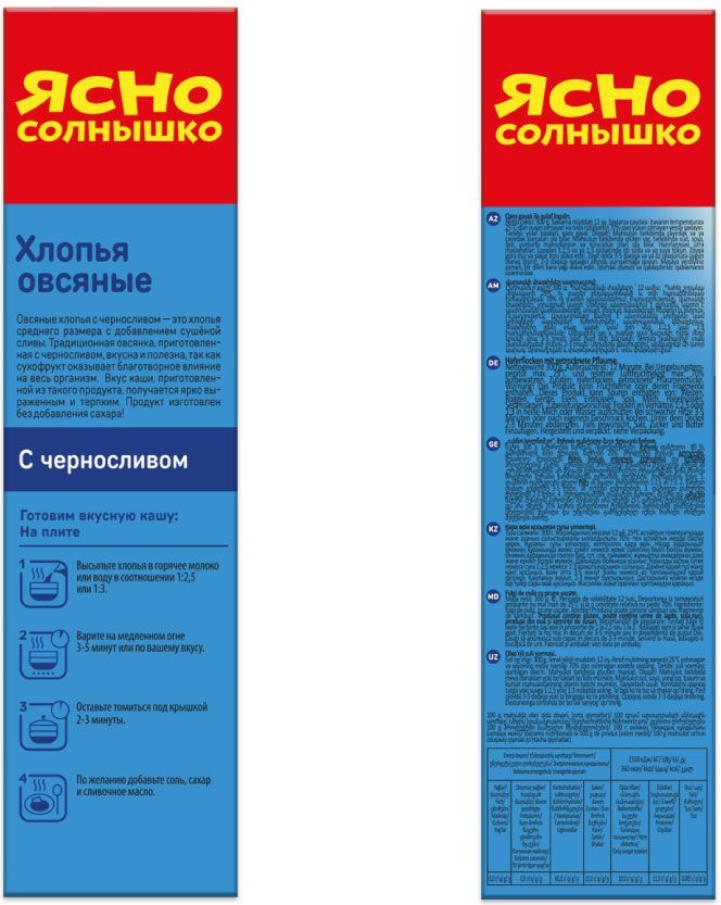 Описание: Разнообразить ваш утренний стол и поддержать отличную привычку питаться правильно помогут овсяные хлопья с черносливом ТМ «Ясно Солнышко». Каша из наших 100% натуральных хлопьев среднего размера с добавлением сушёной сливы обладает исключительной природной сладостью и приятным послевкусием. Готовый продукт богат витаминами, микро- и макроэлементами, он благоприятно сказывается на работе всего организма и способствует улучшению настроения! Питайтесь вкусно и правильно с ТМ «Ясно Солнышко»!
