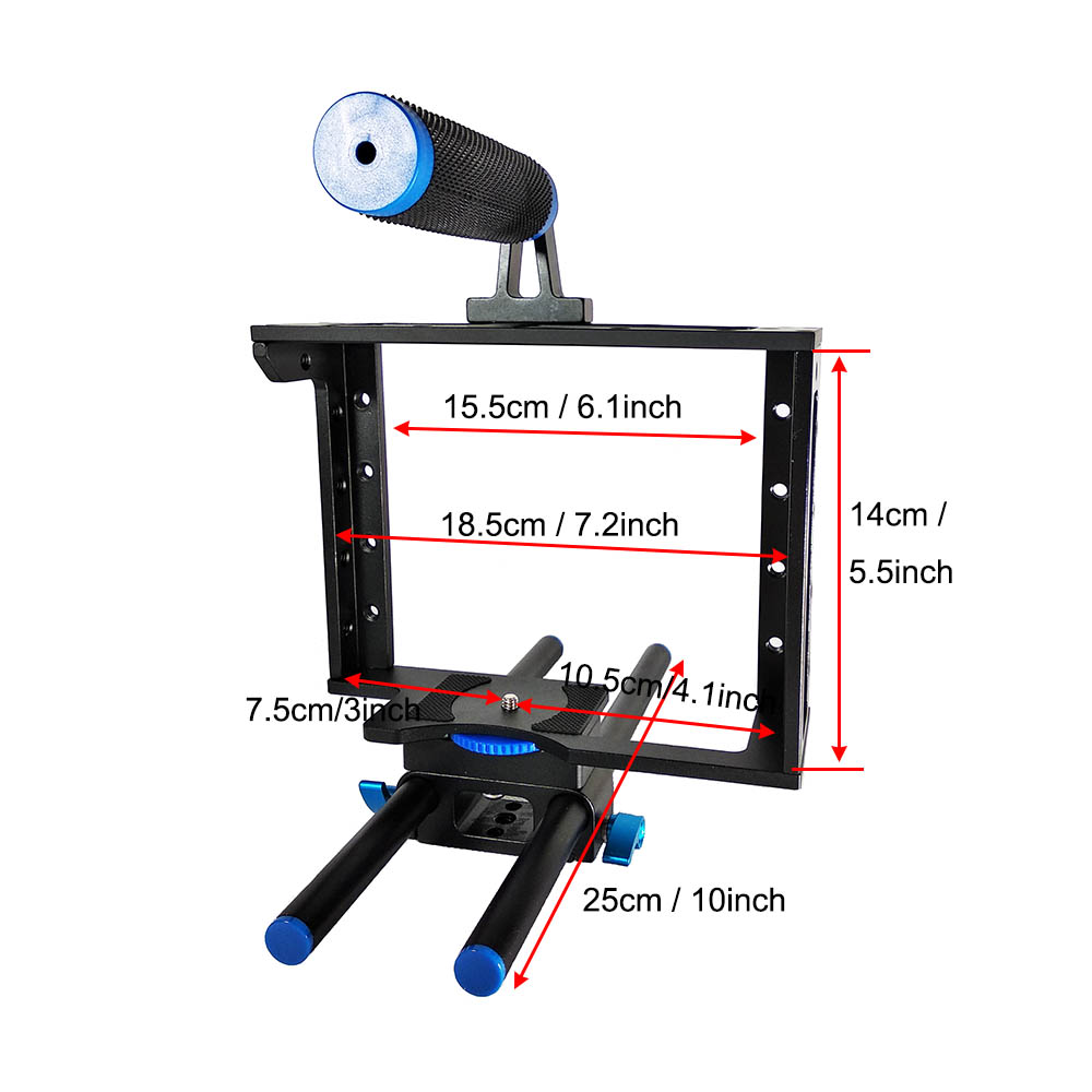 6. Клетка с функцией быстрого крепления, легко устанавливается на камеру, верхняя сторона пористого дизайна, стандартные отверстия для винтов камеры 1/4 ''могут быть подключены к различным типам насадок, таким как волшебная рукоятка, мониторы, микрофоны и т. Д.