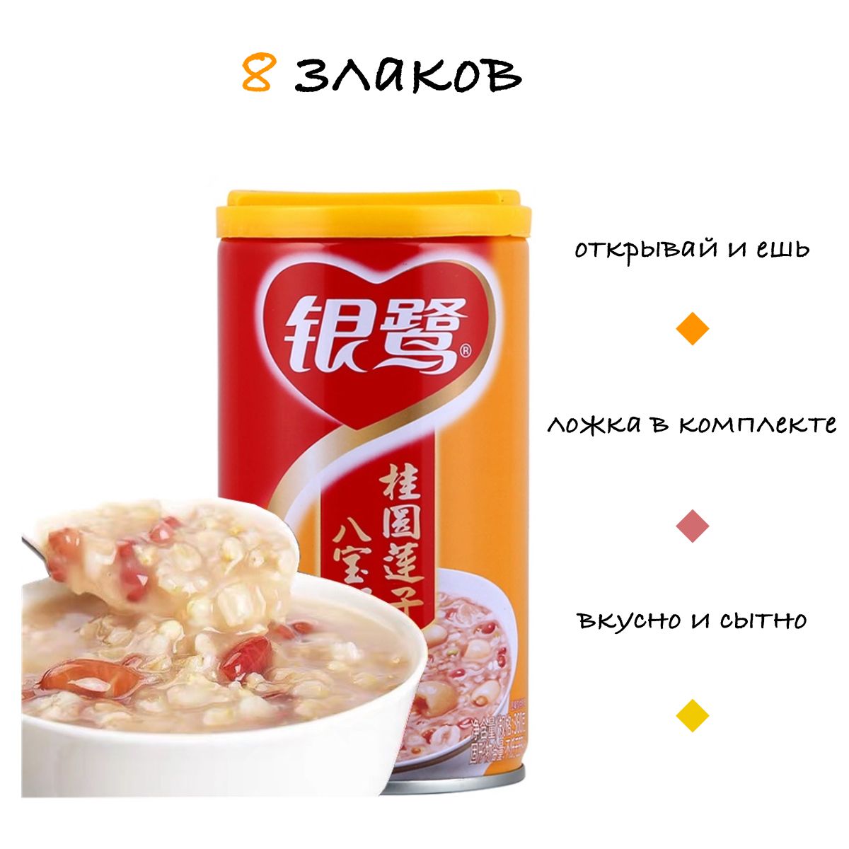 Состав: вода, сахар, клейкий рис, ячмень, бобы адзуки, красная фасоль, арахис, лонган, семена лотоса, тремелла, сложные эфиры жирных кислот сахарозы, стабилизатор, регулятор кислотности, соль.