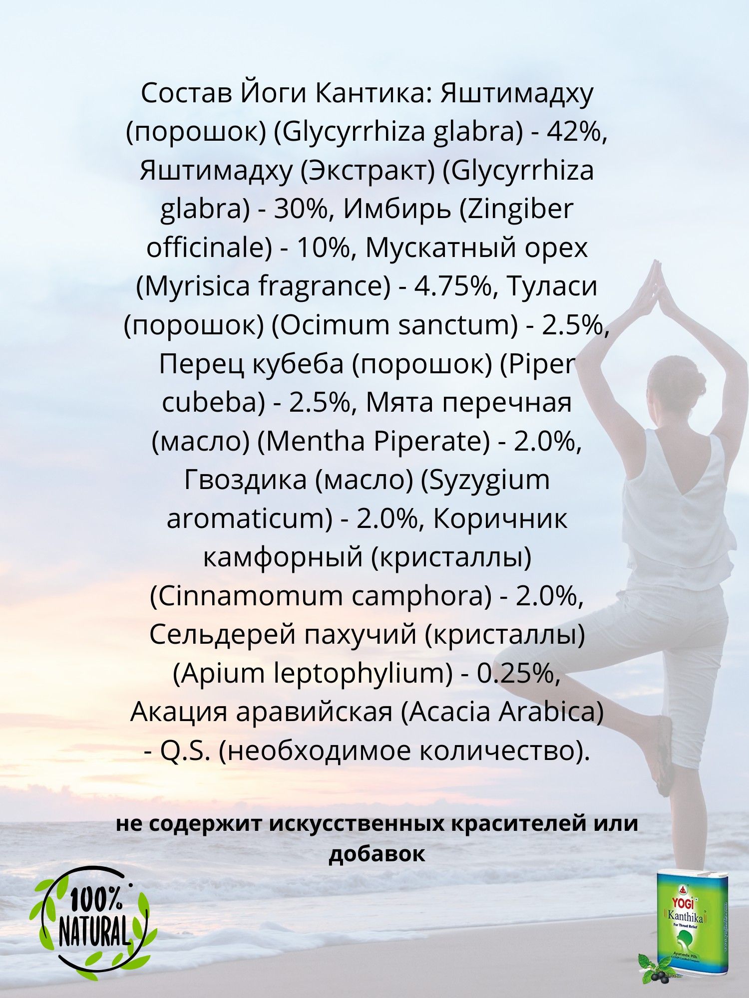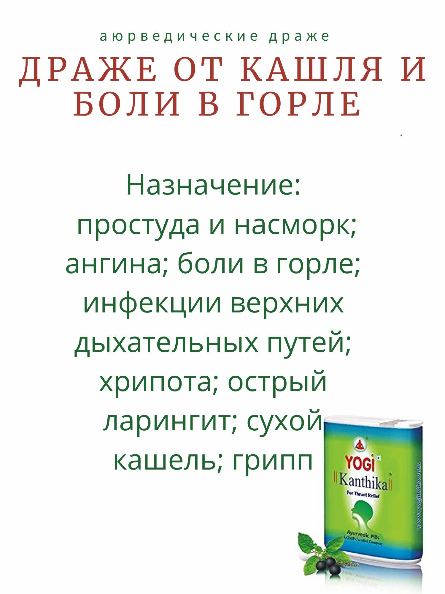Описание: Йоги Кантика - натуральное аюрведическое средство при неприятных ощущениях в горле и для свежего дыхания. Препарат эффективно и в короткий срок облегчает дыхание. Сразу после его приёма улучшается тембр голоса за счёт смягчения голосовых связок. Не содержит сахара, искусственных красителей и других химических добавок. Эти аюрведические драже помогут эффективно справиться с кашлем, хрипотой и першением в горле, устранят воспаления, раздражение, отёк и болевые ощущения в горле. Кроме того, Йоги Кантика надолго устраняет неприятный запах изо рта. Препарат рекомендуется к приёму при первых признаках простудного заболевания, насморке, сухом и продуктивном кашле, при першении и сухости в горле, осиплости голоса у вокалистов, при болях в горле и трудностях при глотании. Инструкция по применению: 2-3 гранулы рассасывать 5-6 раз в день. Назначение: простуда и насморк; ангина; боли в горле; инфекции верхних дыхательных путей; хрипота; острый ларингит; сухой кашель; грипп. Гранулы от воспаления горла Yogi Kanthika представляют собой биологически активную добавку, которая быстро поможет нейтрализовать неприятные, болевые ощущения в горле, а также быстро освежит ваше дыхание и улучшит состояние связок. Его наличие в домашней аптечке поможет эффективно и быстро при возникновении первых симптомов остановить развитие заболевания. Противовоспалительные гранулы «Йоги Кантика» – скорая помощь при простудных заболеваниях Максимально органичный состав сосательных таблеток-гранул Ayurvedic Pills For Threat Relief Yogi Kanthika, без искусственных красителей и сахара, избавит вас и вашу семью от отечности в горле, уберет болезненные ощущения, красноту и воспаления слизистых, хрипы, а также кашель. Приём препарата показан при возникновении боли в горле, ангине, первых признаках простуды – кашле и насморке, инфекциях в верхних дыхательных путях, гриппе. Органический состав делает их безвредными и безопасными даже для самых маленьких членов семьи. Имбирь укрепляет иммунную систему, улучшает обмен веществ, выводит токсины и шлаки из организма, благотворно сказывается на структуре кожи, улучшает цвет лица, разгоняет кровообращение, сжигает жир. Обладает качествами:·         тонизирующим;·         заживляющим;·         противовоспалительным;·         антибактериальным;·         бактерицидным;·         спазмолитическим и др. Гвоздика улучшает пищеварение и полезна при простудах, кашле, гайморите, ларингите и некоторых других заболеваниях. Известна своим согревающим и дезинфицирующим действием, нейтрализует неприятные запахи. Мята имеет сильные бактерицидные и седативные качества, приятно охлаждает и успокаивает раздражения, расширяет сосуды, стабилизируя давление, помогает активному восстановлению организма. Мускатный орех избавляет и очищает от слизи, выводит мокроту, заметно улучшает звучание голоса. Туласи (базилик) облегчает симптоматику протекания кашля и откашливание, обеспечивает дезинфекцию ротовой полости, обладая сильным антибактериальным свойствам, помогает предотвратить распространение заболевания. Как использовать: Рассасывать 5-6 раз в день с четким соблюдением дозировки. Дети и подростки в возрасте от 5 до 12 лет – 1-2 драже. Взрослые и дети старше 12 лет – 2-3 гранулы.
