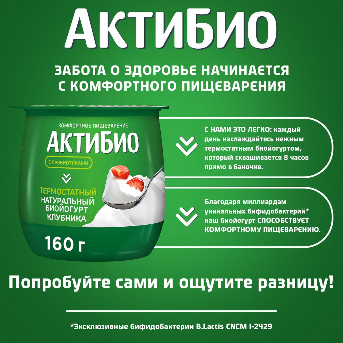 Описание: ЗАБОТА О ЗДОРОВЬЕ НАЧИНАЕТСЯ С КОМФОРТНОГО ПИЩЕВАРЕНИЯ С нами это легко: каждый день наслаждайтесь нежным термостатным биойогуртом, который сквашивается 8 часов прямо в баночке. Благодаря миллиардам уникальных бифидобактерий* наш биойогурт способствует комфортному пищеварению. Попробуйте сами и ощутите разницу! *Эксклюзивные бифидобактерии B.Lactis CNCM I-2429.