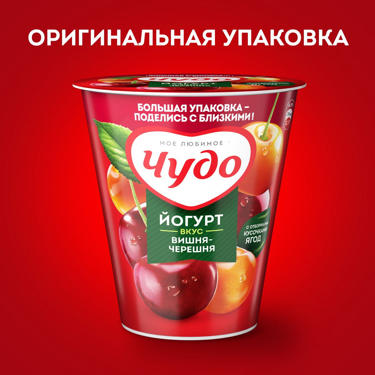 Описание: Густой йогурт Чудо в большой упаковке, которую можно разделить с близкими ●Нежный йогурт с отборными кусочками ягод ●Гармоничное сочетание вкусов вишни и черешни ●Отличный вариант для завтрака или перекуса ●Большая упаковка