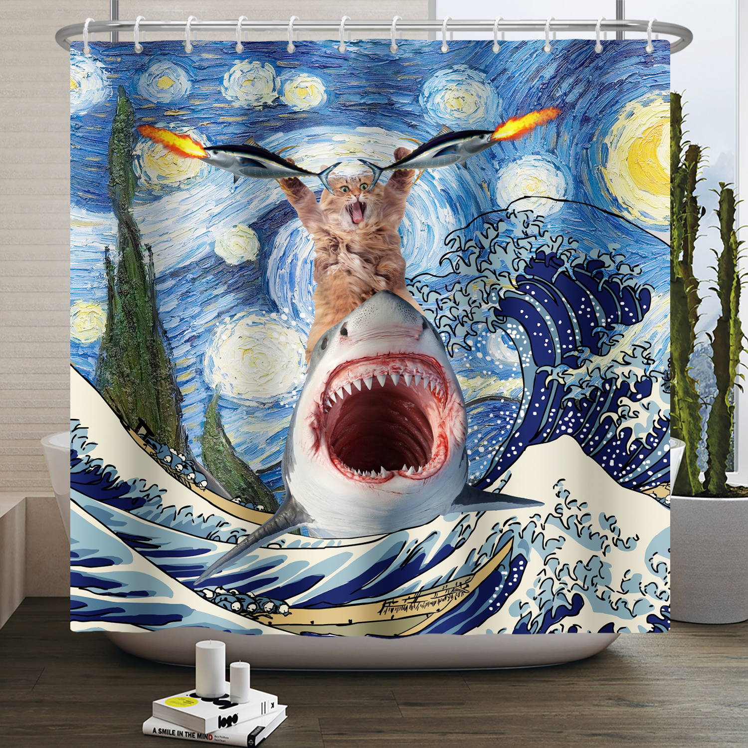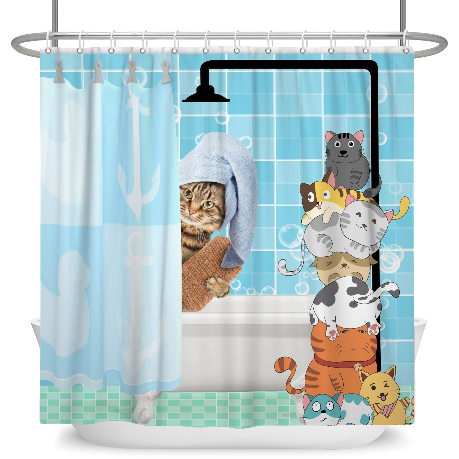 Забавная занавеска для душа в виде кошки, милая крутая котенок для верховой езды, Кита, мультяшное животное, океанская волна, Детская фотозанавеска с крючком