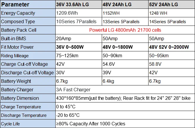 Capactity 52V 48V 36V 35Ah 30Ah 24Ah 25Ah