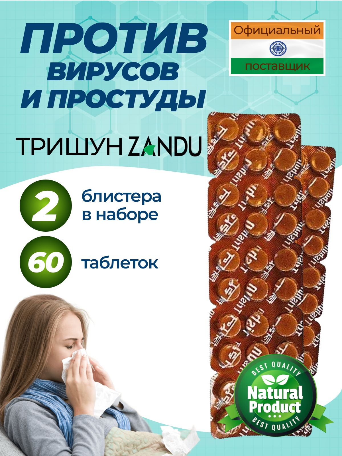 Занду Тришун (Zandu Trishun), 60 шт., против простуды, для укрепления иммунитета, противовирусное средство