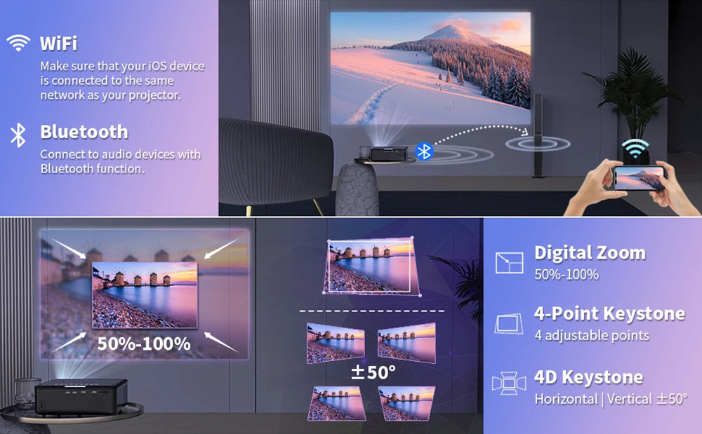 • 🎵【4-точечная/4D функция трапецеидального искажения и масштабирования, потолочное крепление и пульт дистанционного управления】 4-точечная/4-направленная функция коррекции трапецеидальных искажений, которая может Легче регулировать идеальное прямоугольное изображение. Функция масштабирования позволяет уменьшить размер изображения со 100% до 50% с помощью пульта дистанционного управления. В нижней части проектора есть 4 отверстия для винтов, которые можно легко и надежно установить на потолок, оснащенный пультом дистанционного управления.