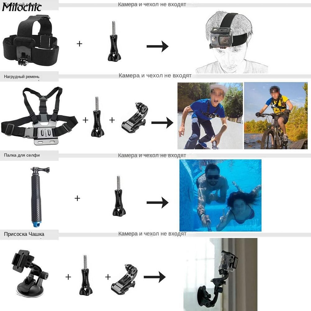 3. Несколько вариантов ремешка: В комплект входят различные типы плечевых ремней, которые подходят для головы, груди, плечевого ремня с поворотом на 360 градусов, а также ремни и крепления для любого типа транспортного средства. Это позволяет снимать высококачественные экшн-кадры с любого ракурса.