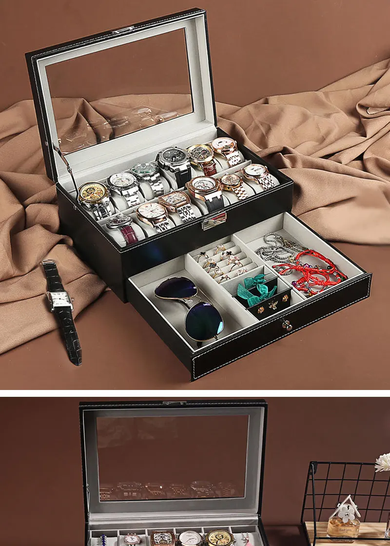 12 Slot PU Leather Lockable Watch Storage Boxes Men & Women Jewelry Display Drawer Case, 2-Tier Organizer Watch Showcase
