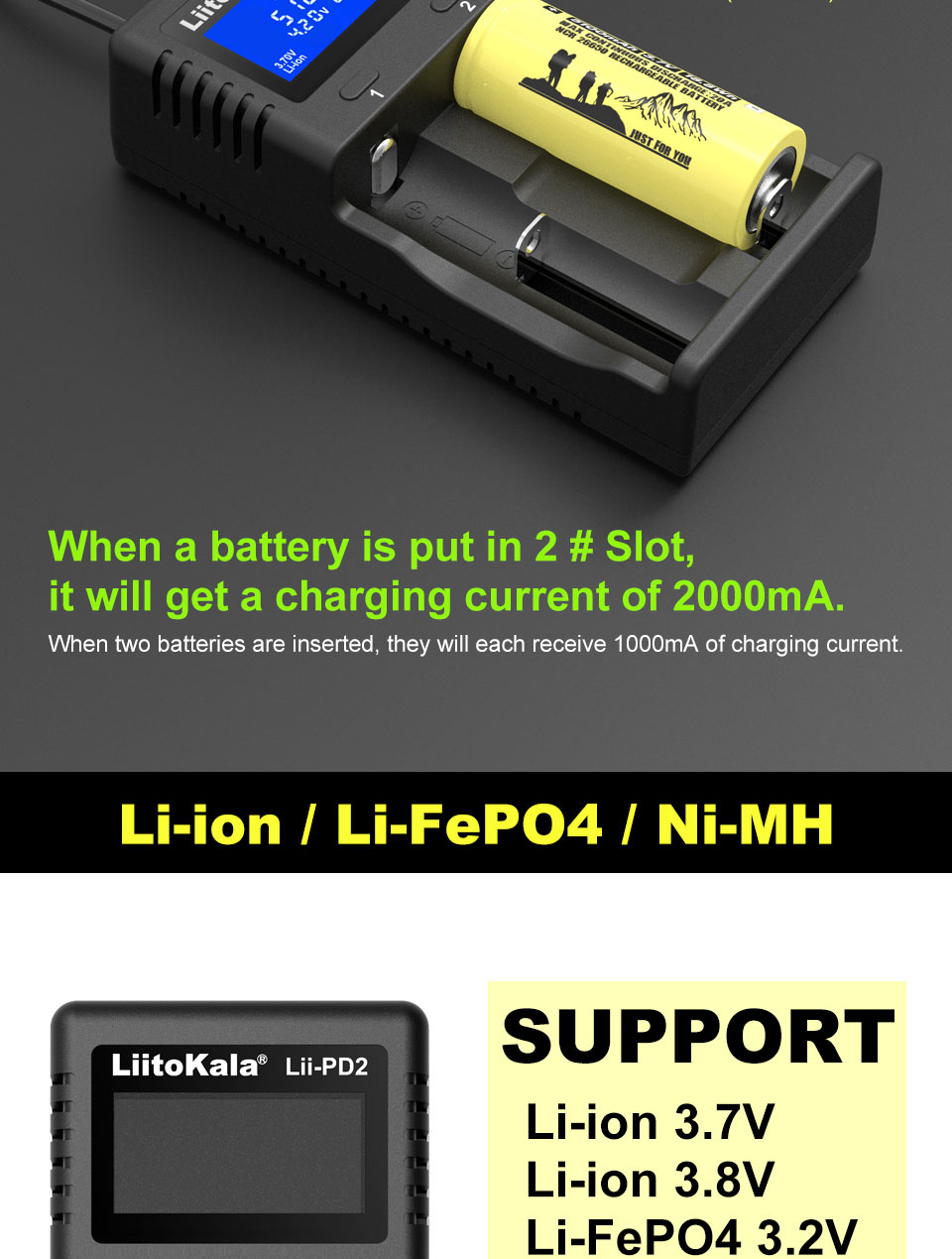Литий-ионный 3,70 В/литий-ионный 3,85 В (IMR); общий зарядный ток двух слотов не превышает 2 А, то есть когда один из слотов заряжен током 2 А, А затем аккумулятор заряжается в другом слоте, передний ток 2А снизится до тока 1А; Когда аккумулятор полностью заряжен, на ЖК-дисплее отобразится ПОЛНЫЙ;