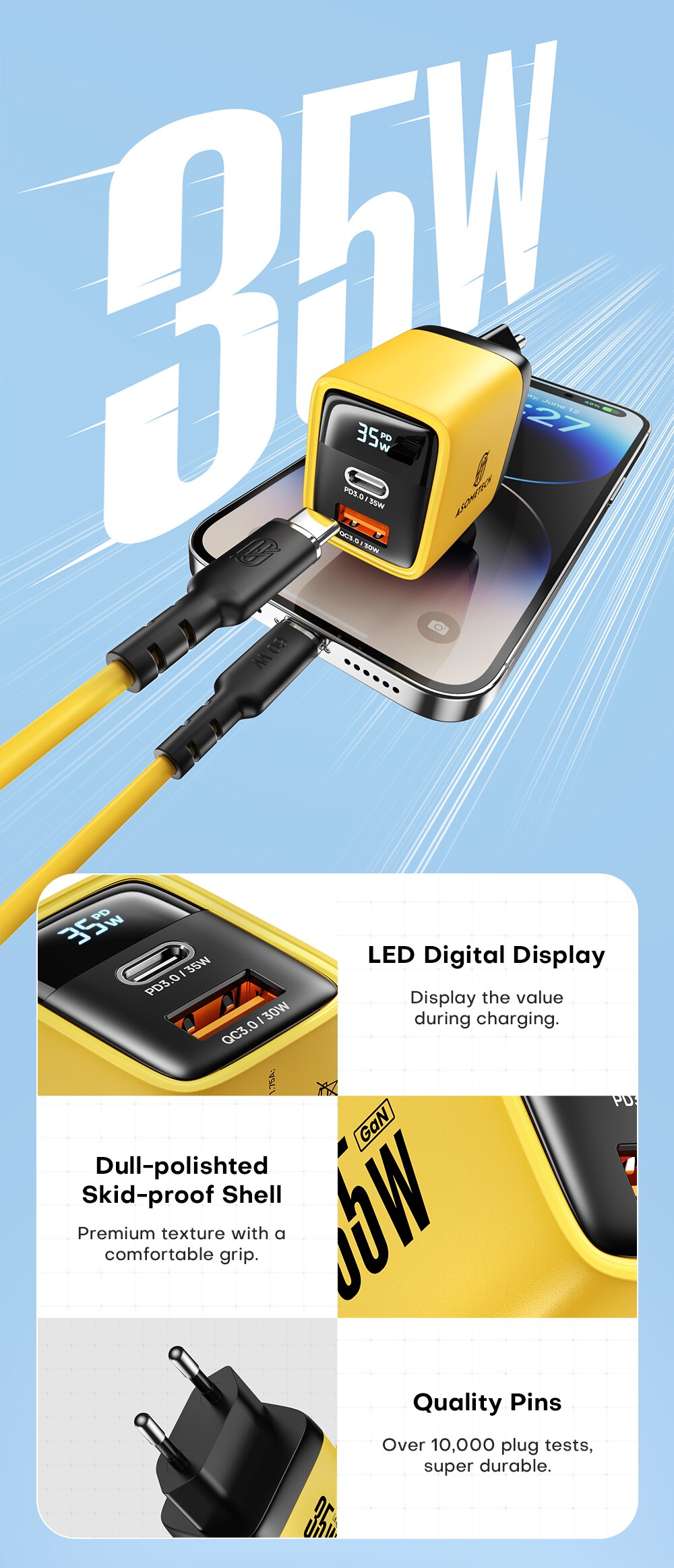 ?【Многопортовое зарядное устройство】: 1 USB-C порт и 1 USB-A порт обеспечивают 35 Вт для телефонов, планшетов, ноутбуков и т. Д.!?【Светодиодный индикатор + цифровой дисплей】: зарядное устройство ASOMTECH 35 Вт с колонным светодиодным индикатором и цифровым ЖК-дисплеем, во время зарядки вы можете видеть фактическое значение выходной мощности.?【Расширенные функции безопасности】: Оснащен нашей совершенно новой системой безопасности GaN, обеспечивающей повышенную защиту. Оснащен динамическим датчиком температуры, который активно контролирует температуру, и чипом силового тюнера, который регулирует выходную мощность для защиты подключенного устройства.?【Универсальная совместимость】 Зарядное устройство ASOMETECH мощностью 35 Вт с PD3.0 QC4.0 QC3.0 PPS AFC FCP SCP SSCP Протокол быстрой зарядки совместим с iPhone 14/Plus/Pro Max, MacBook Air, иПад Про/воздух/мини, иФоне 13/13 Про/13 Про Макс/13 Мини/12/12 Про/12 Про Макс, и галактика Самсунг и больше приборов;?【Компактный и портативный】 Это быстрое зарядное устройство USB C отличается сверхкомпактной и легкой конструкцией со складными зубцами для максимальной портативности, куда бы вы ни отправились. Прочный корпус из АБС-пластика и компоненты премиум-класса защищают от царапин, ударов и падений, идеально подходят для дома, офиса и путешествий.