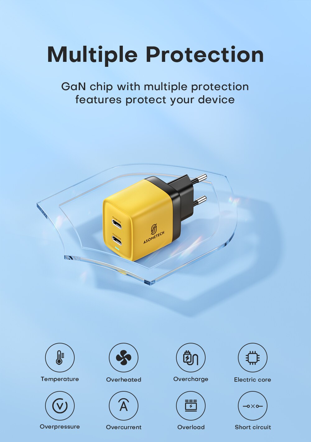 Зарядное устройство ASOMETECH сетевое с двумя USB-портами и поддержкой быстрой зарядки, 40 Вт