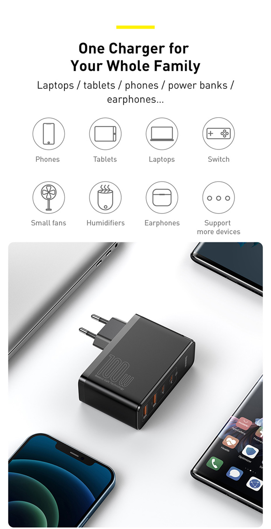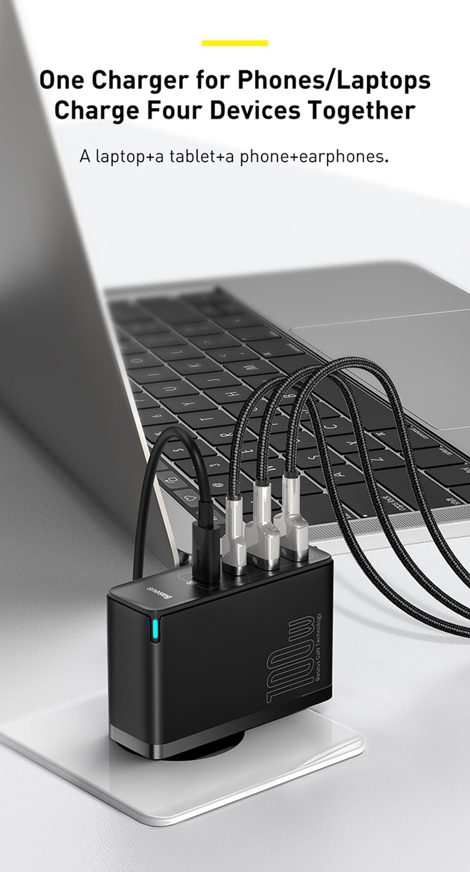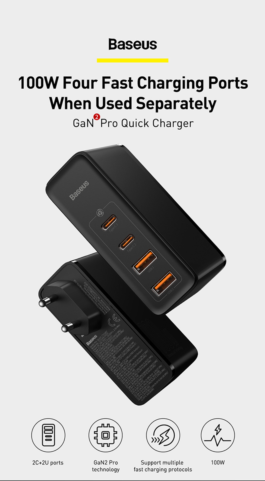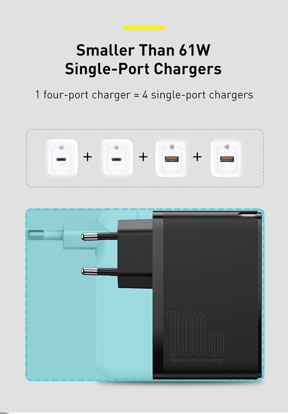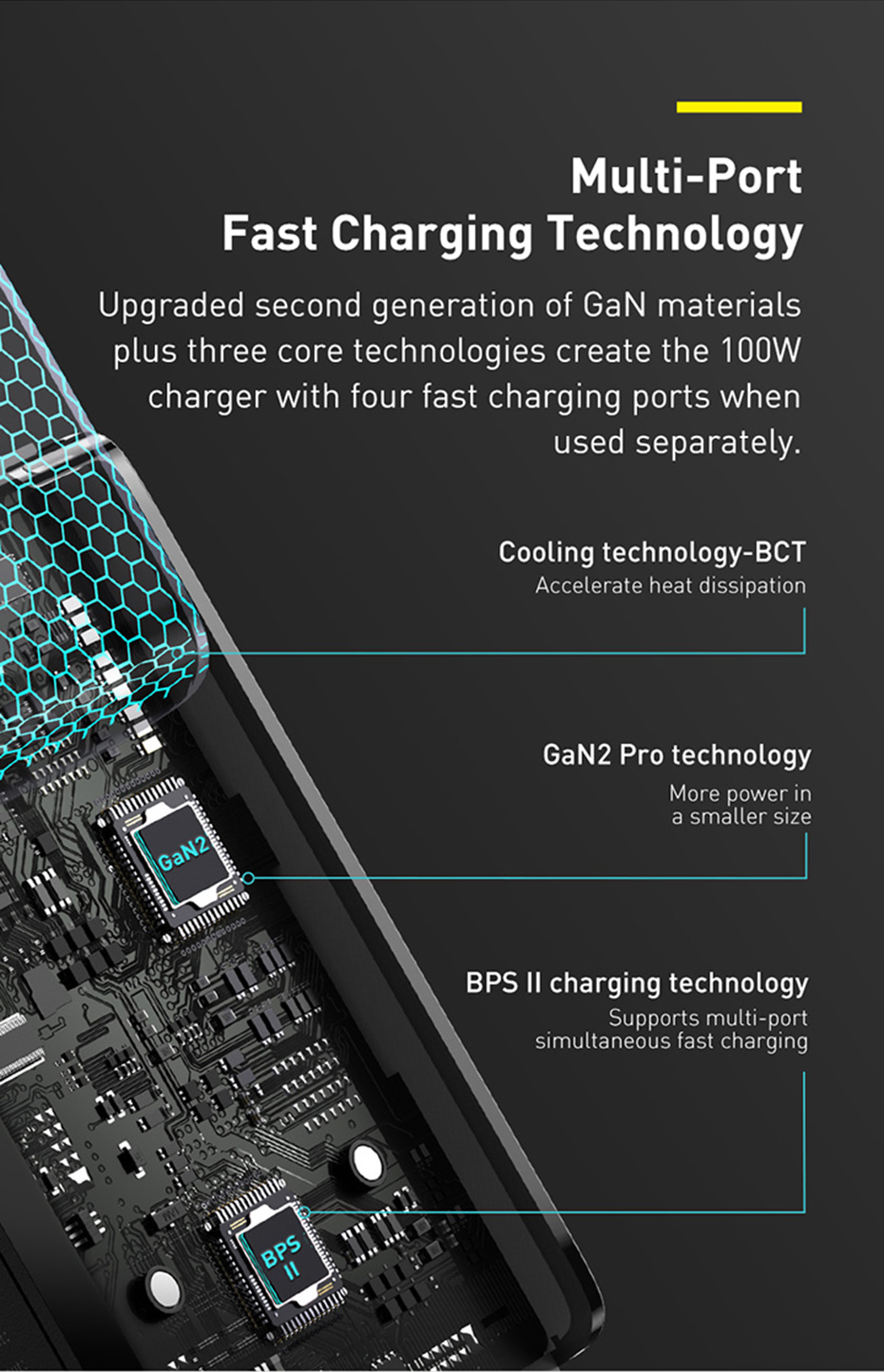 Модернизированное второе поколение гановых материалов и три основные технологии, которые создают 100W chager с 4 портами быстрой зарядки при использовании отдельно.