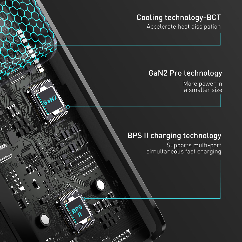 BCT (технология охлаждения Baseus). Инфракрасный резонансный эффект поверхности радиатора извлекается из нанотехнологии, которая ускорит быстрое излучение тепла с поверхности радиатора, чтобы эффективно повысить эффективность рассеивания тепла.