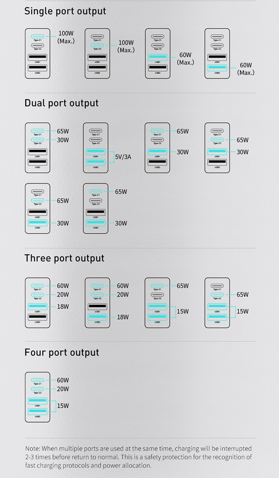 Type C 1 + Type C 2 + USB 1 Output 60W + 20W + 18W