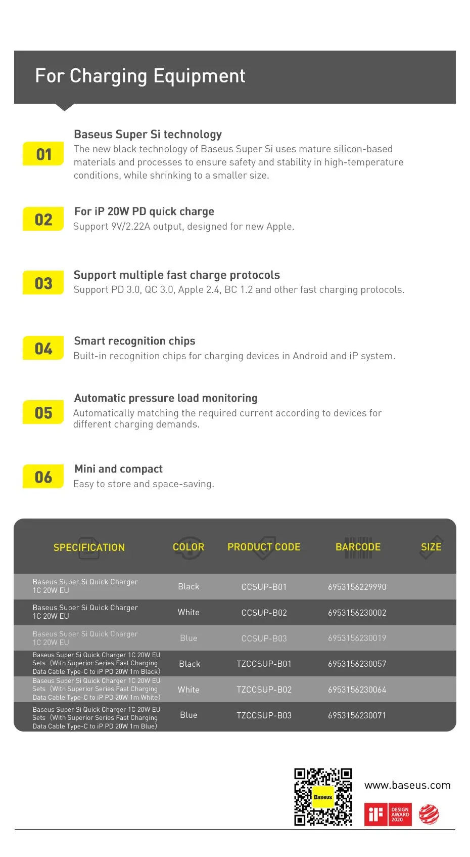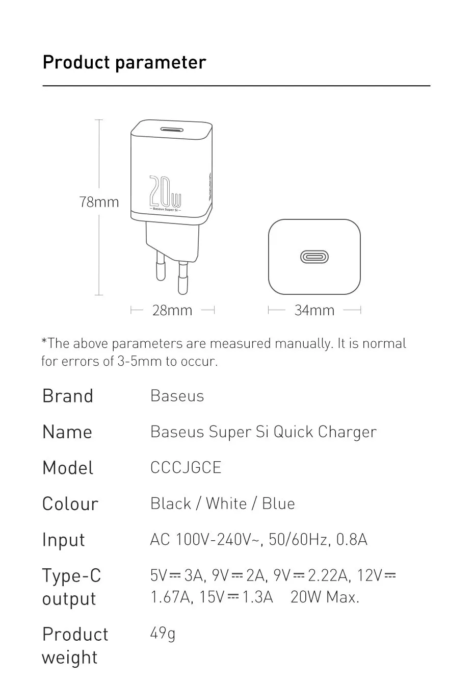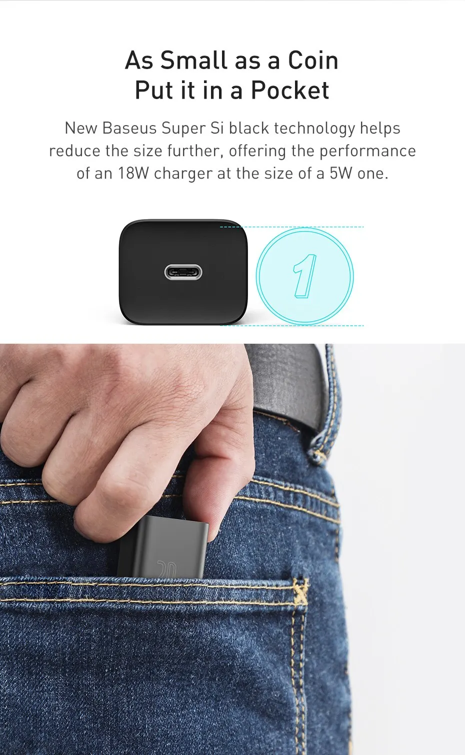 Зарядное устройство Baseus сетевое с USB Type-C и поддержкой быстрой зарядки, 20 Вт