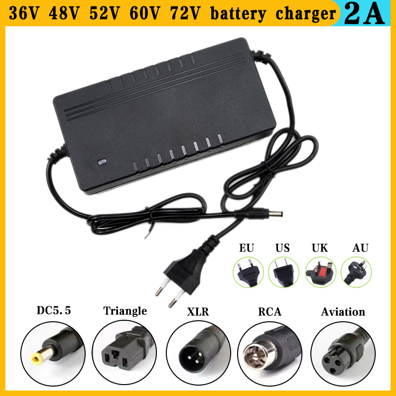 42V 54,6 V 58,8 V 67,2 V 84V 2A Зарядное устройство для литиевой батареи AC 100-240V для 36V 48V 52V 60V 72V 10Ah 15Ah 20Ah 25Ah 30Ah Электрический скутер электрический велосипед 10S зарядное устройство для литий-ионных аккумуляторов серии 13S 14S 16S 20S DC 5,5*2,1 мм Вилка для ЕС/США/Австралии/Великобритании