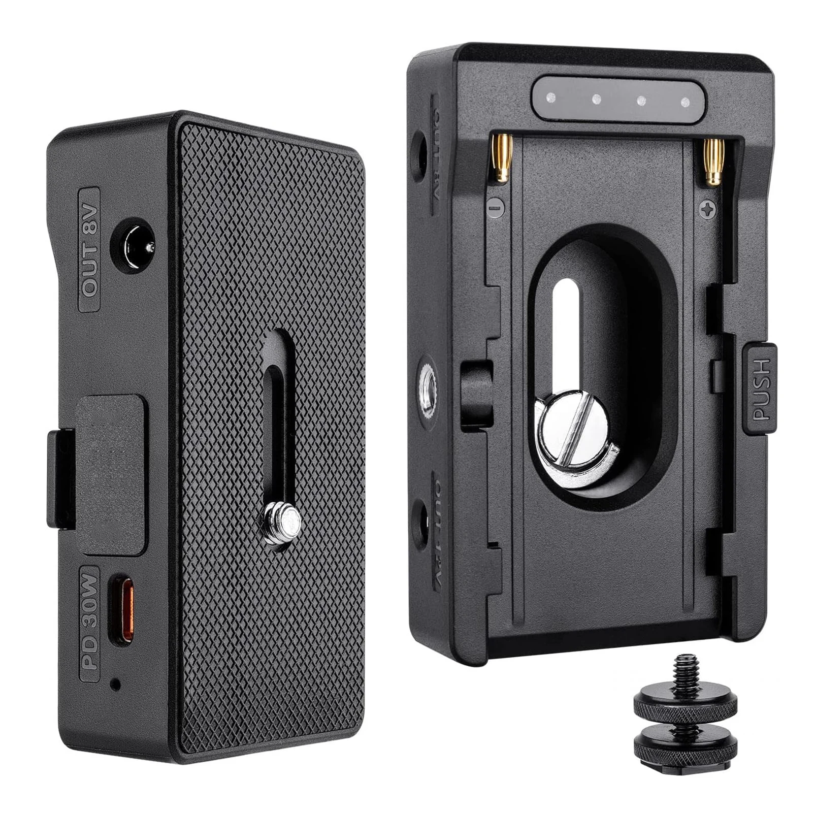 1/4 дюймовые отверстия для винтов и адаптер для холодного башмака позволяют легко установить пластину аккумулятора на камеру, кожух камеры или другие устройства.