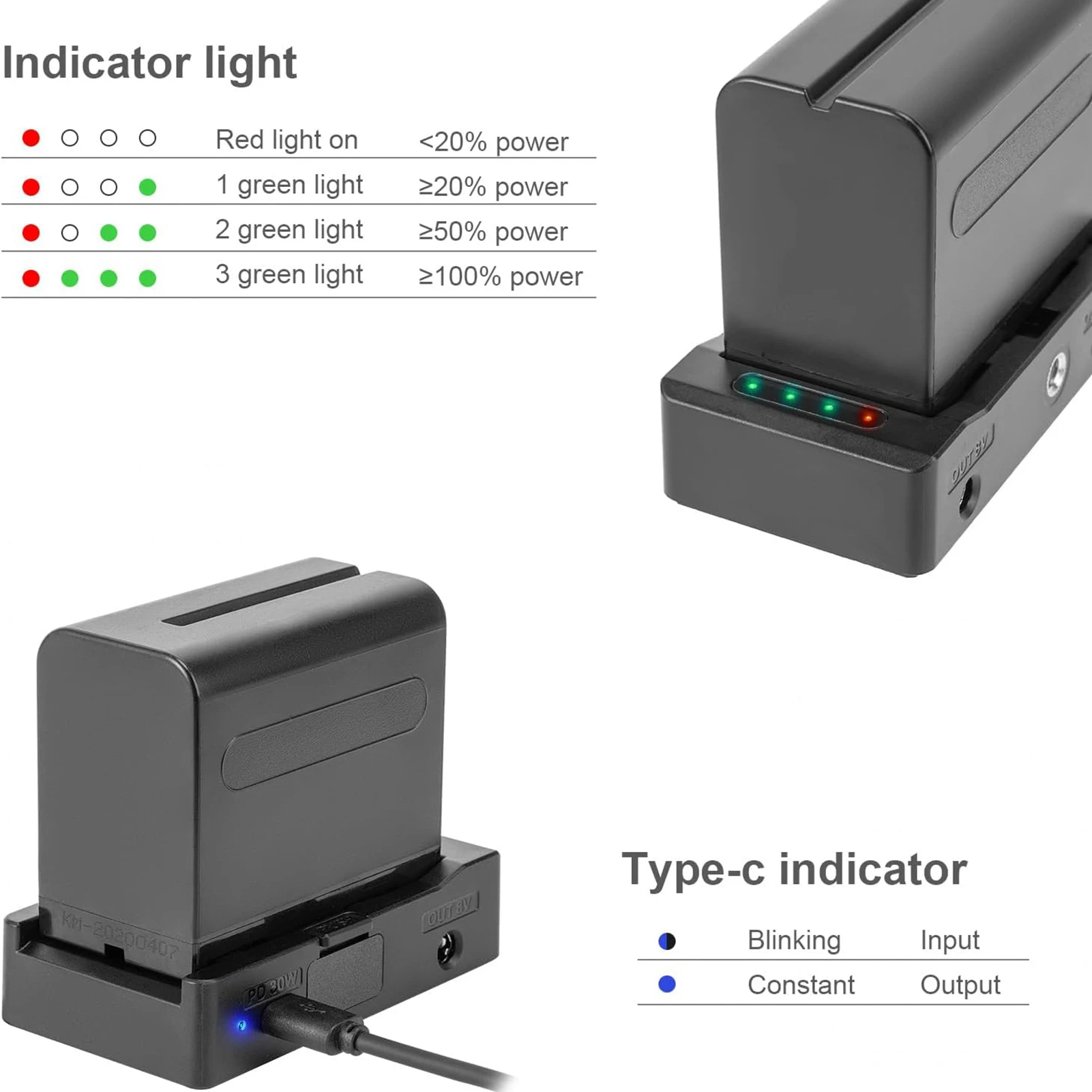 С 4 световыми индикаторами (25%-50%-75%) для четкого отображения остаточной емкости аккумулятора.