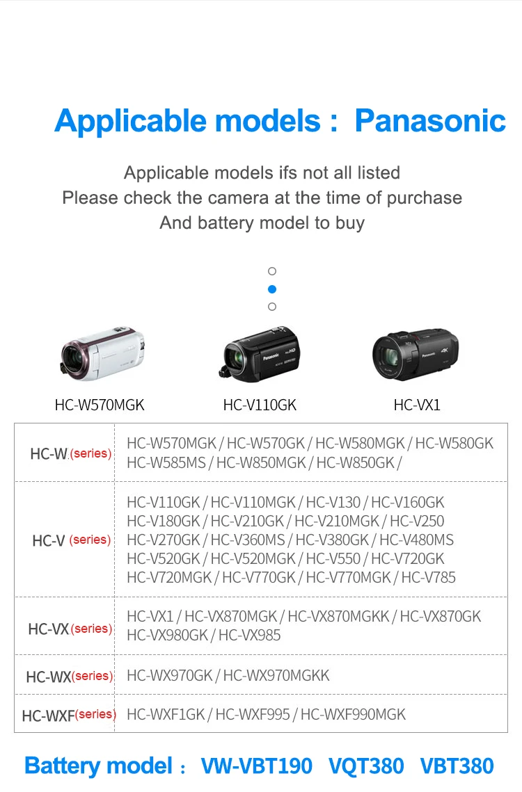 Зарядное устройство для Panasoinc HC-W570 W580 W585 W850 V110 V130 V160 WXF1 WXF955 WXF990 V180 V210 WX970