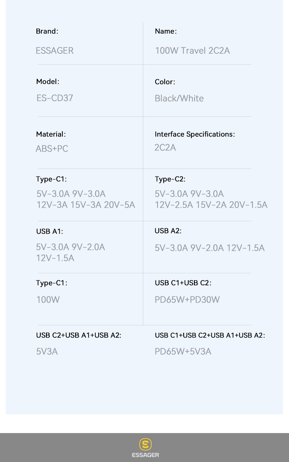 • Высокая Выходная мощность:При максимальной выходной мощности 100 Вт это зарядное устройство может работать даже с самыми энергоемким устройствами, такими как MacBook Pro.