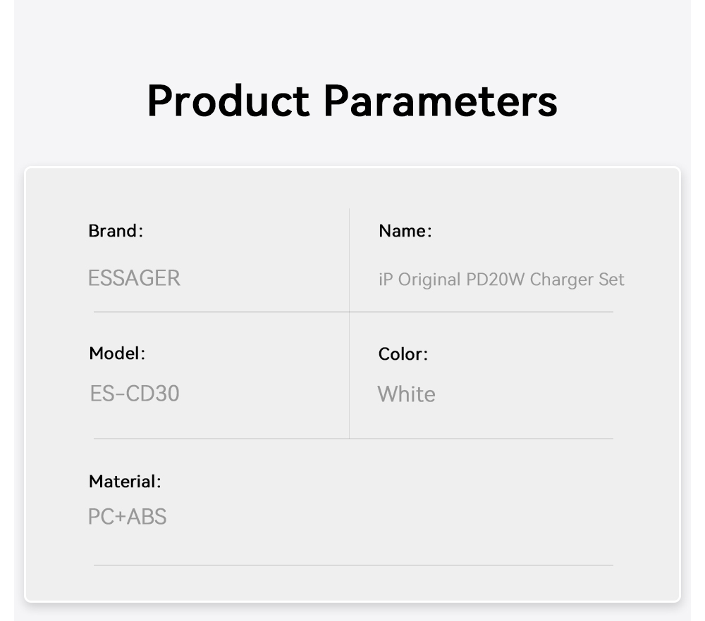 <span class="SnowProductCharacteristics_SnowProductCharacteristicsItem__titleContent__534v9">Name</span> Essager PD 20W Charger For IPhone
