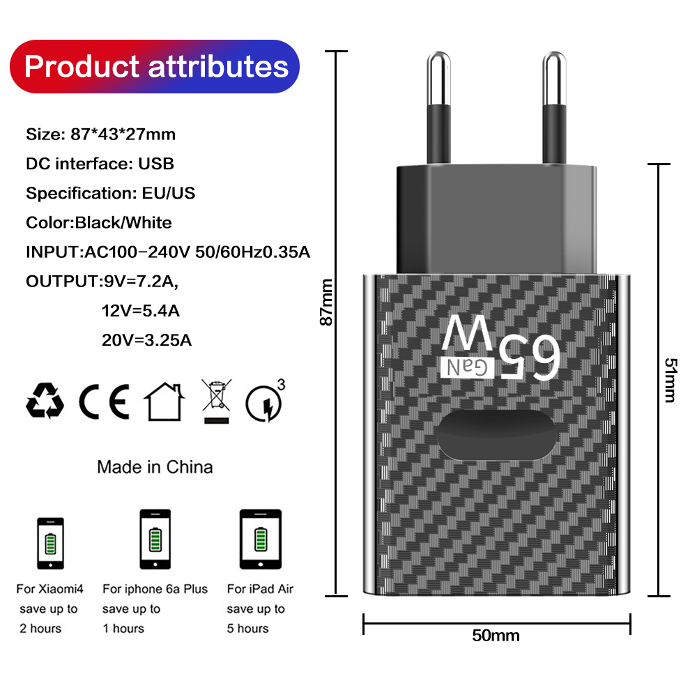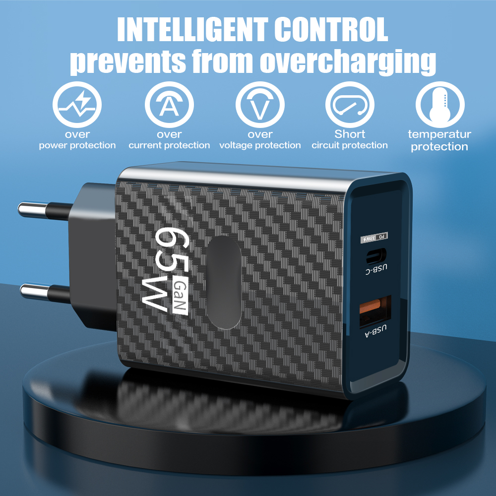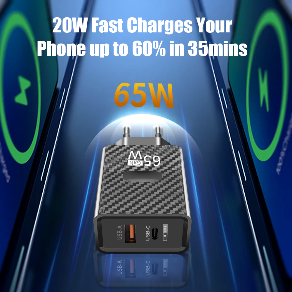 Зарядное устройство GaN мощностью 65 Вт, быстрая зарядка, USB C, высокоскоростное зарядное устройство для Xiaomi 12, Samsung Iphone 14 Pro, настенный адаптер